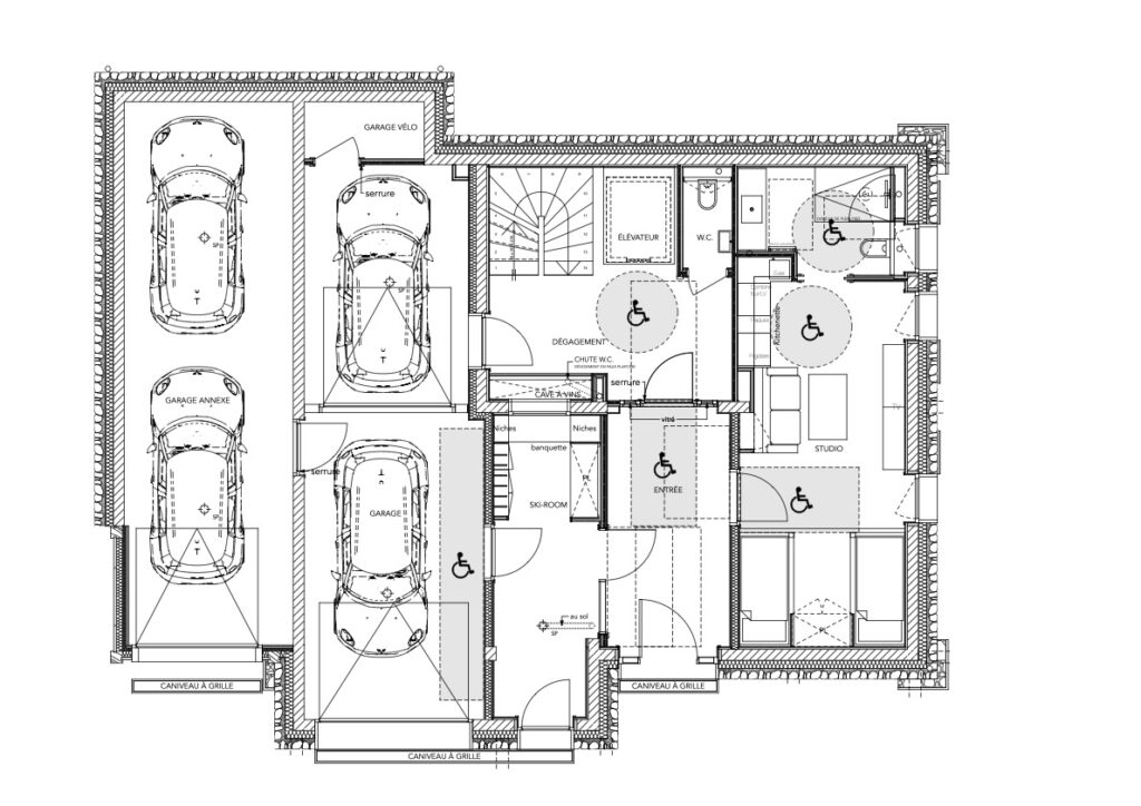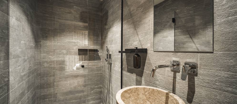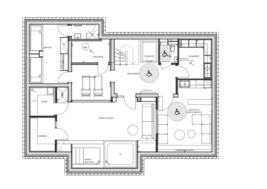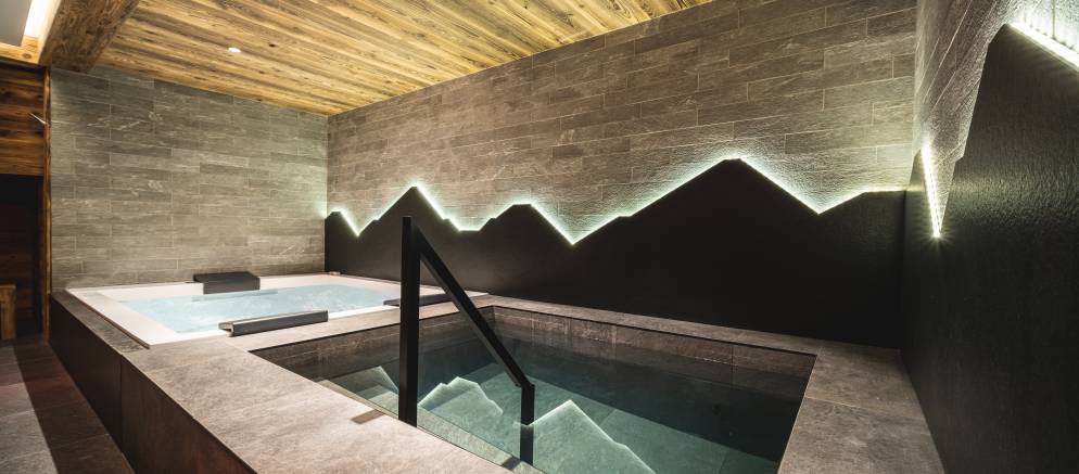 Also on the lowest level are the extensive spa and entertainment facilities. Choose between hot and cold rejuvenation with a dip in the hot tub or refresh in the 10° cold bath. To sooth tired muscles the hammam will help to detox and revive whilst the warmth of the sauna will envelop you in relaxation. The fitness room with rower and weight bench is ready for anyone with any energy left to burn.