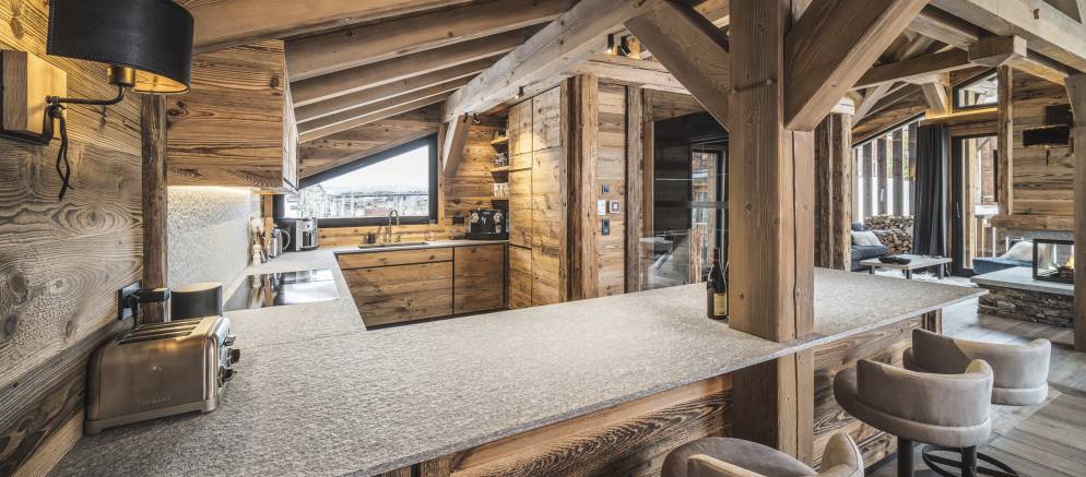 The top floor set beneath the beautiful, beamed roof and with large picture windows, is home to the communal living spaces. There are two separate lounge areas divided by the feature fireplace which sits at the centre of this room. Balconies on two sides let you enjoy the mountain views firsthand. The huge dining table seats up to 20 guests and is perfect for sharing quality time together in the evenings. The adjacent kitchen is fully equipped with all you need for a self-catered holiday, and the breakfast bar perfect for some pre-dinner drinks.