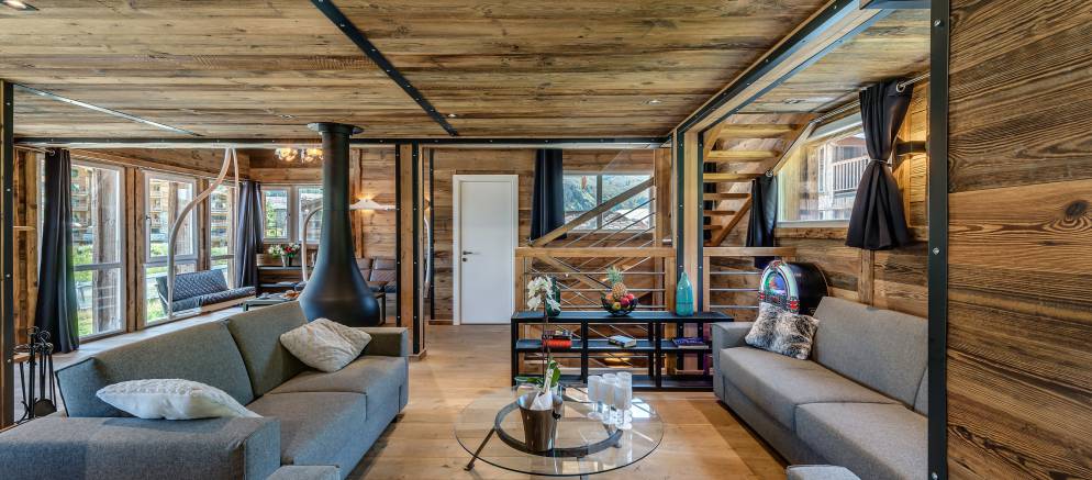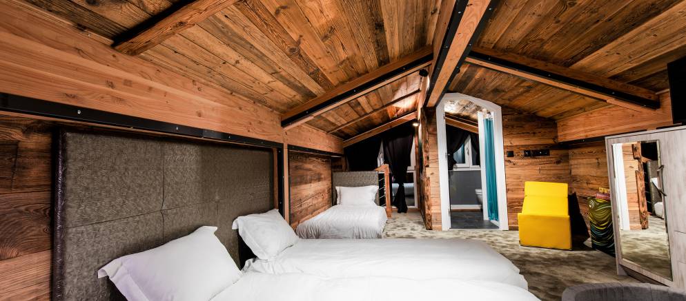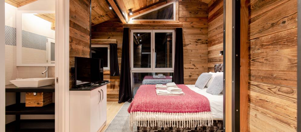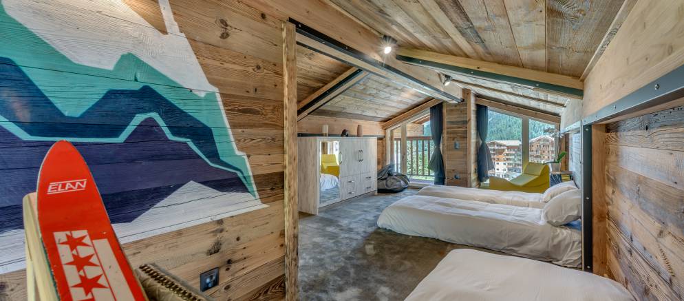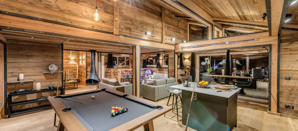 The main open plan living spaces are spread across the second floor. The living room benefits from a double height ceiling and vintage ski equipment that has been repurposed into unique furniture and fittings. The fully equipped kitchen has all you need for whipping up delicious home cooked meals. The pool table and large TV mean there is plenty of entertainment to be enjoyed in this spacious and convivial space.