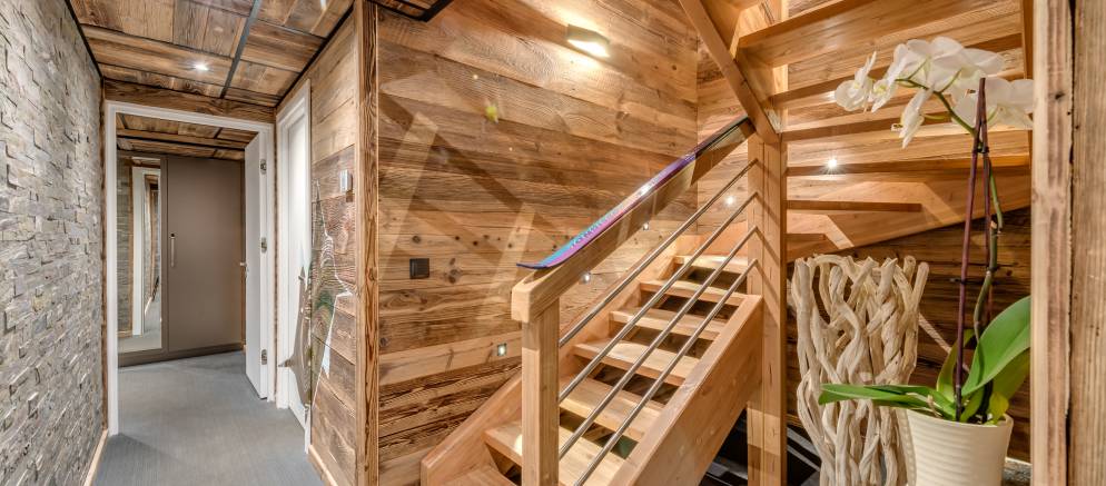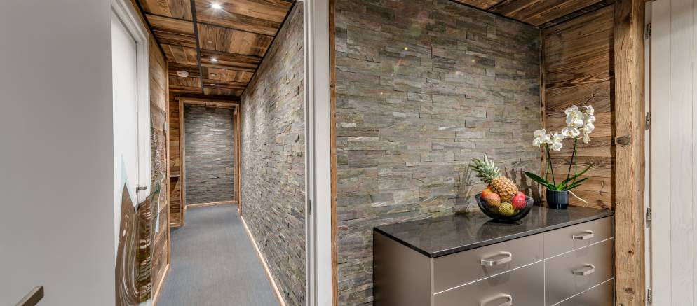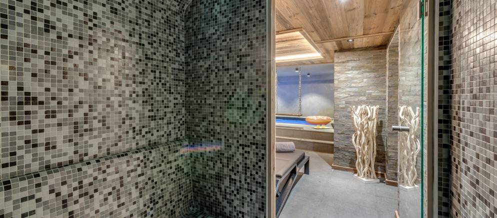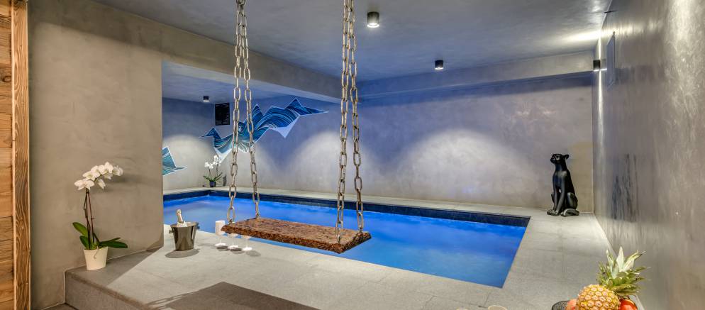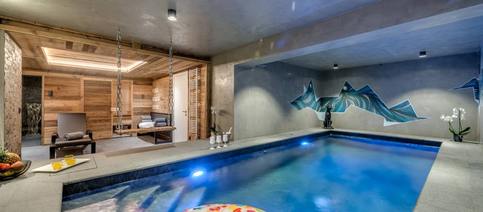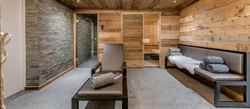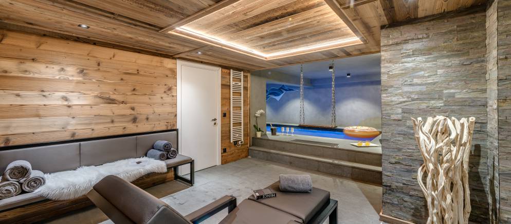 The chalet is arranged over four floors and 380m2 of living space. Entering the chalet on the ground floor you can conveniently enter directly into the ski and boot room, and for those self-driving to resort there is a garage with space for 1 car. The rest of this floor is dedicated to the private spa and wellness facilities with an indoor swimming pool, relaxation area, sauna and steam room.