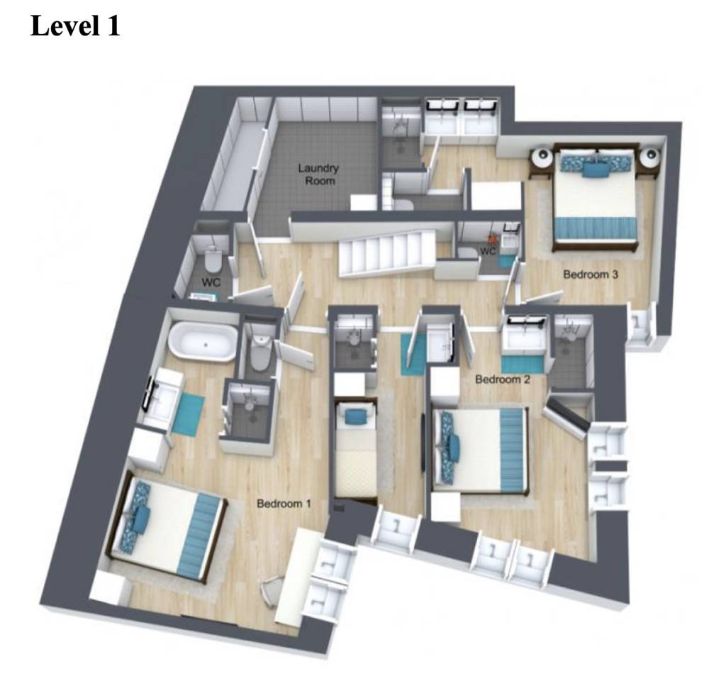Taking the stairs down one level we arrive at the sanctuary of the bedrooms, where tranquillity and comfort await. There are two double or twin bedrooms, as well as one bedroom with a fixed double bed. The fourth bedroom has a bunk bed which children will just love. All bedrooms have either an en-suite bath or shower. Two bedrooms have en-suite toilets, and the other two have separate toilets in the hallway.