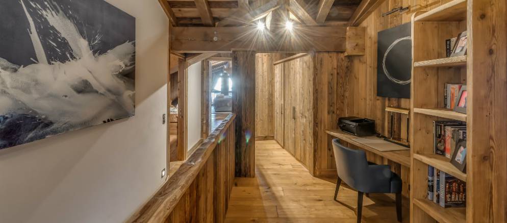The main living area is located on the lower floor featuring an open plan seating arrangement around a cosy, atmospheric fireplace. Adjoining the living area is an elegant dining room and separate kitchen which opens onto a balcony with mountain views. Upstairs you will find a study area for those who need a quiet space to catch up with some work.