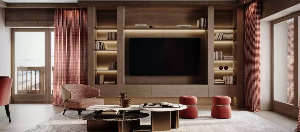 Apartment Le CINQ is located on the second floor and offers 111m2 of harmonious living space thoughtfully designed for family getaways or gatherings with friends. The interior ambiance is contemporary yet soft, enhanced by beautiful furnishings and natural light. The open plan living area with lounge, and dining area with open kitchen, flows onto a sun-drenched terrace and a balcony with breathtaking mountain views.