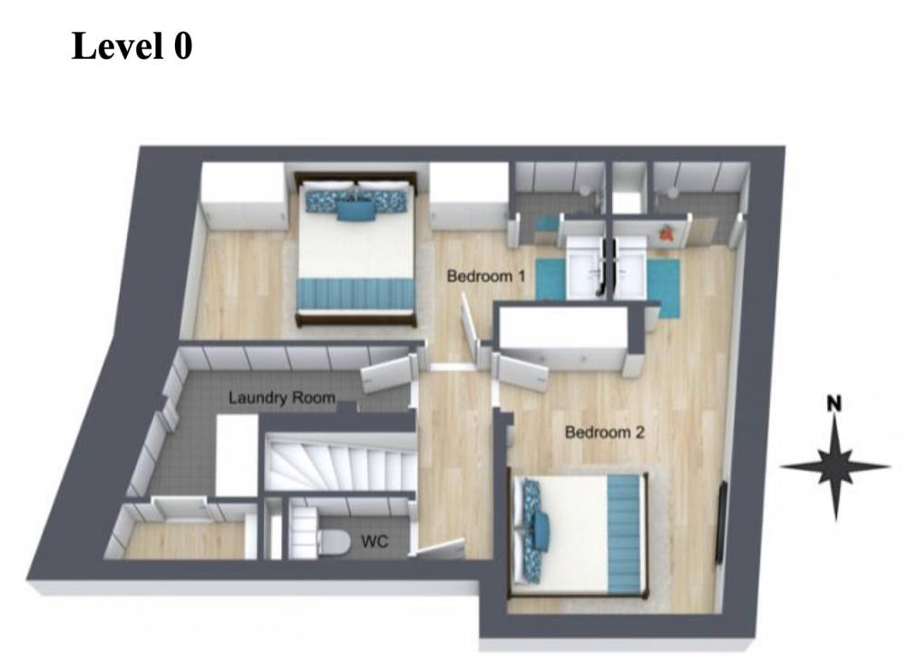 Heading downstairs to the bottom level of the apartment and you will discover two more beautiful bedrooms, each equipped with private shower rooms for added indulgence. This floor is completed with a laundry room, which young families will no doubt particularly appreciate, as well as an independent toilet.