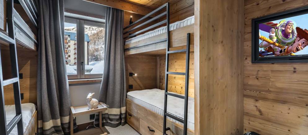 Children’s bedroom with 2 x bunk beds sleeps 4 (90×190) with TV and en-suite shower.