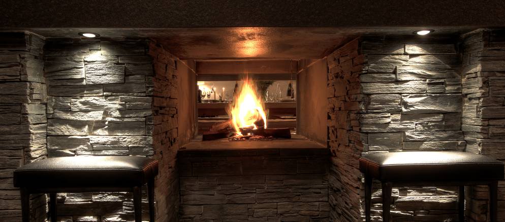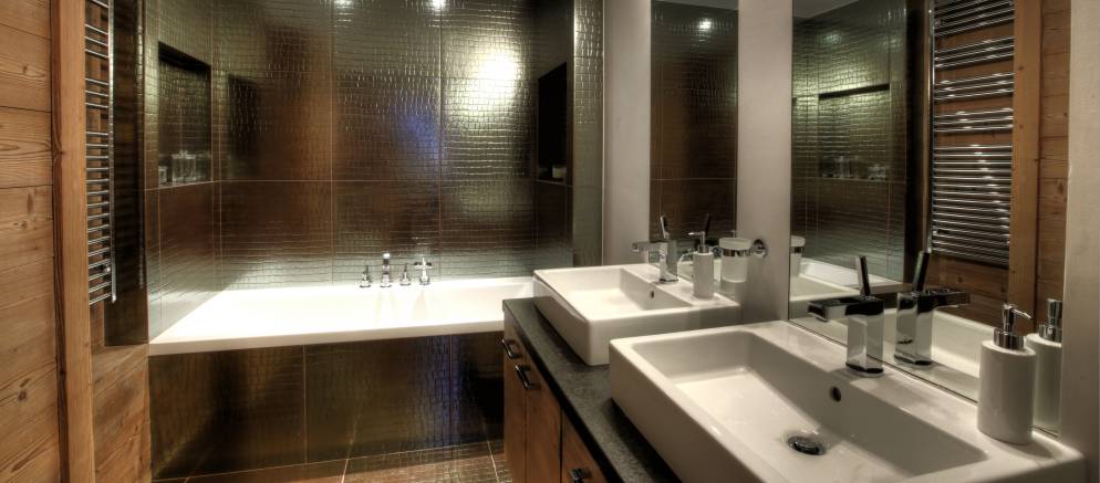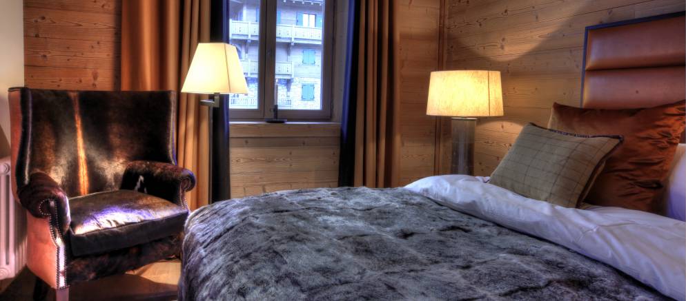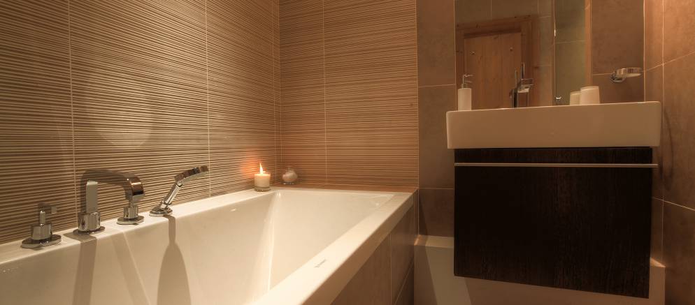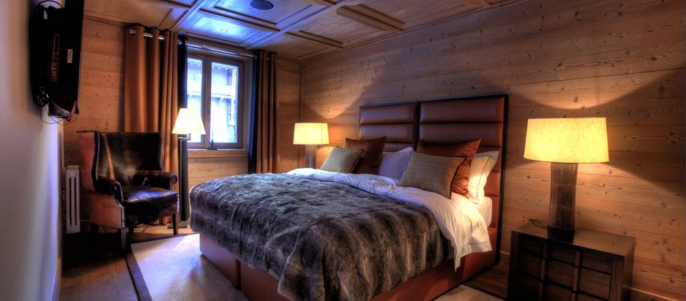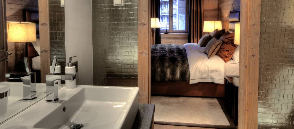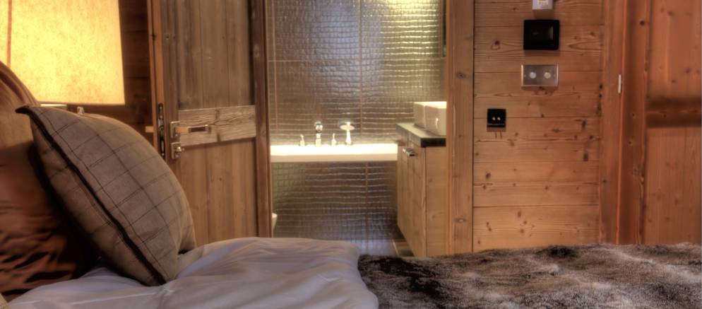 The chalet is on the second floor of the building and is thoughtfully designed to be both spacious and intimate. As you enter there is a large open chimney that divides the open plan living and dining area. The open fire can be seen from the dining area and lounge which creates a cosy warm atmosphere after a long day on the slope. The bespoke furniture and local materials that have been used creates a beautiful space that is great to socialise and relax in.