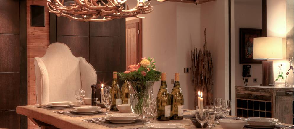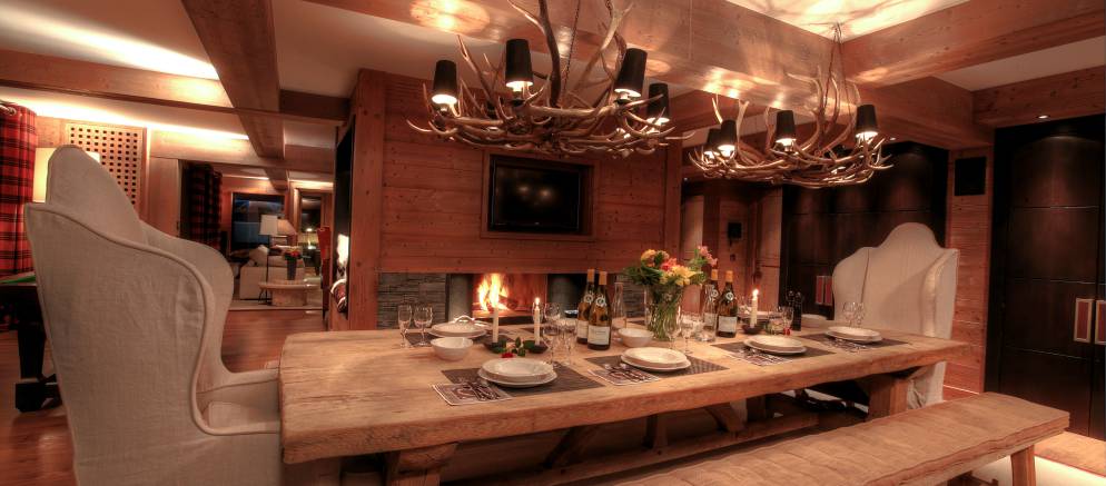 The living area comprises voluminous white sofas and designer chairs which provide a luxury mountain feel. There are also cow hide arm chairs by the fire for late night relaxing or reading.The large dining table with comfortable benches stretching both sides happily seats 12. Next to the dining table is an open fire, TV shut away and great windows that look over the mountains.