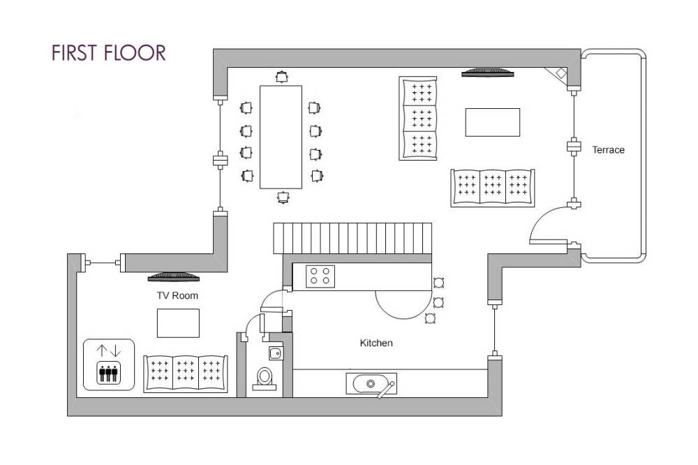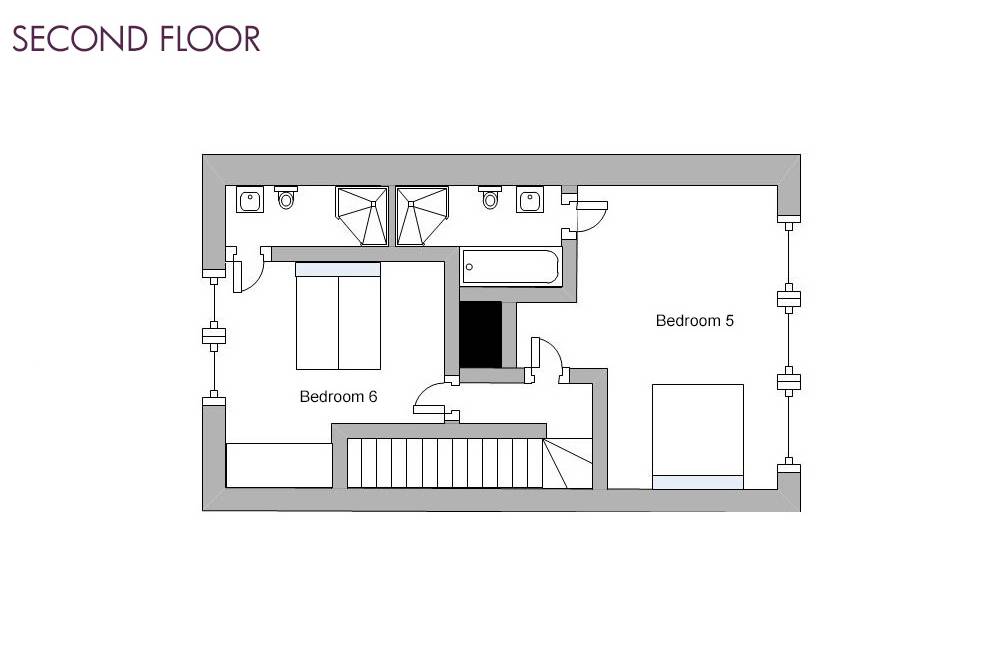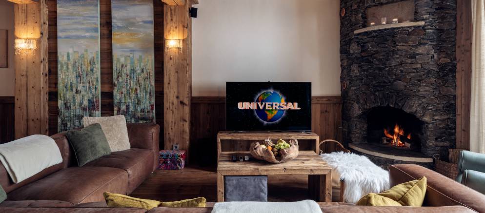On the first floor there is a large open plan living room with a dining table seating a maximum of 10 people. From the living room with its cosy fireplace, doors open onto the south-facing balcony. There is a TV area separate from the living area, which is great for those keen to snuggle up in front of the TV.