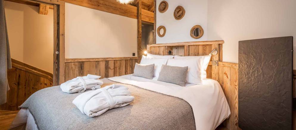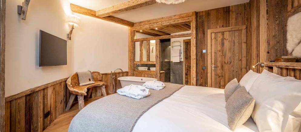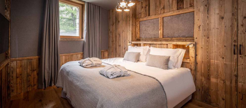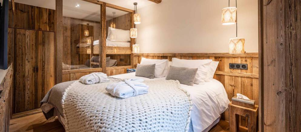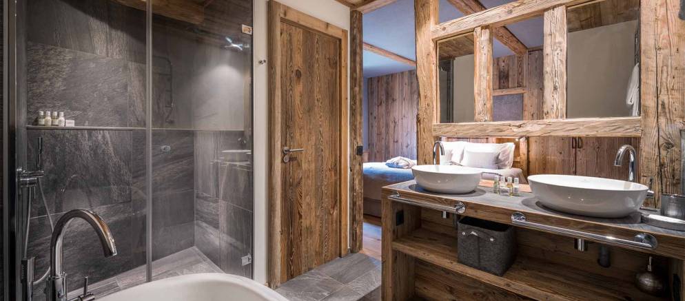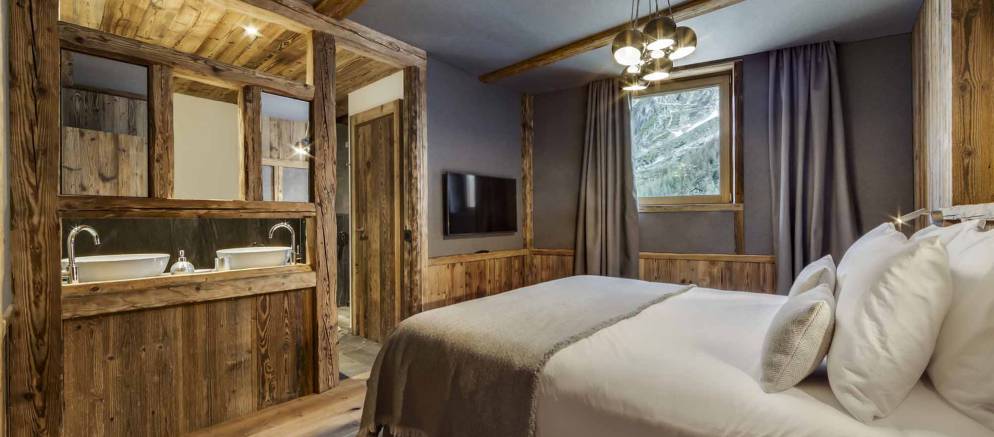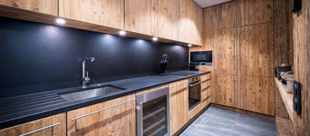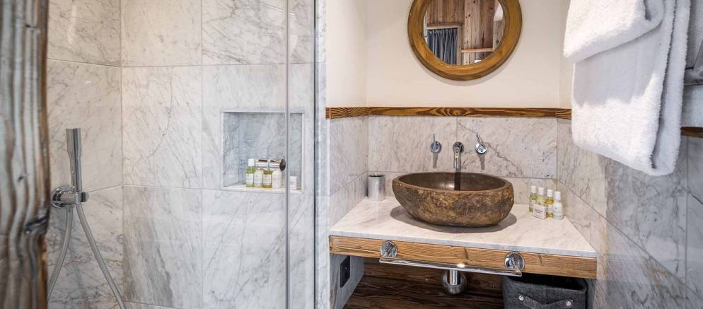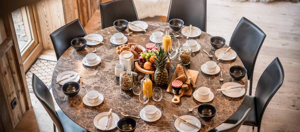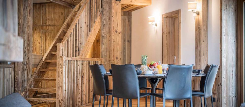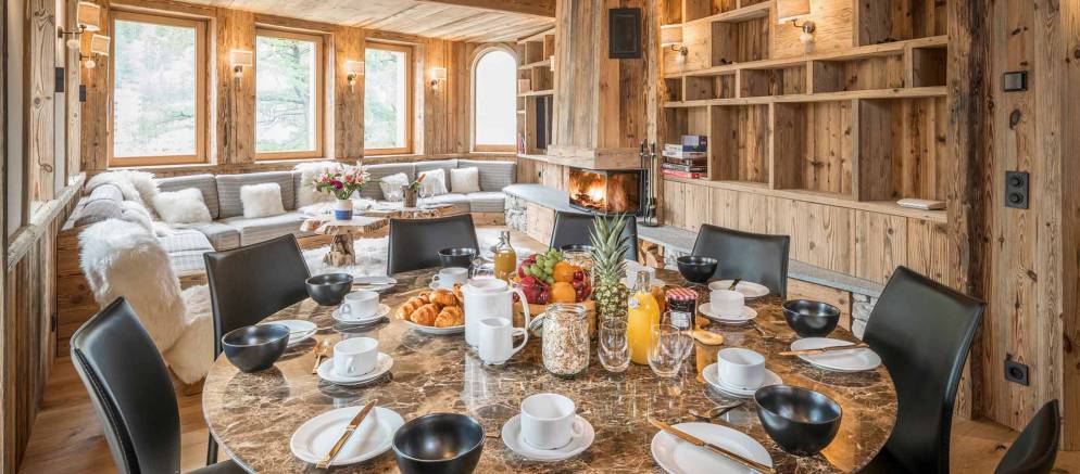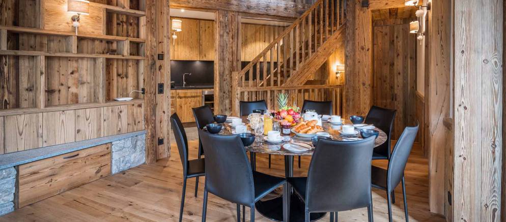 The chalet is arranged over four floors and 220m2 of living space. The open plan living spaces feature a central wood burning fireplace and large windows that frame the view of the mountains. Relax fireside on the bespoke corner sofa before enjoying dinner at the round marble dining table that seats eight guests comfortably. The kitchen is tucked away behind the staircase giving it a private feel but ensuring the cook in your group can still be part of the action.