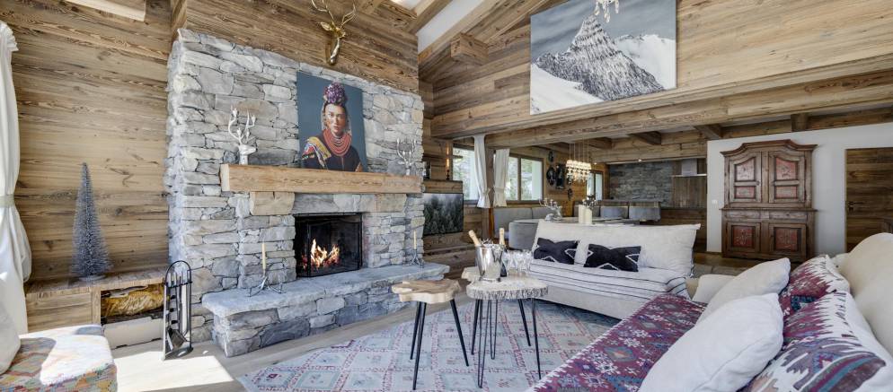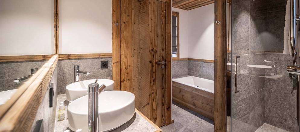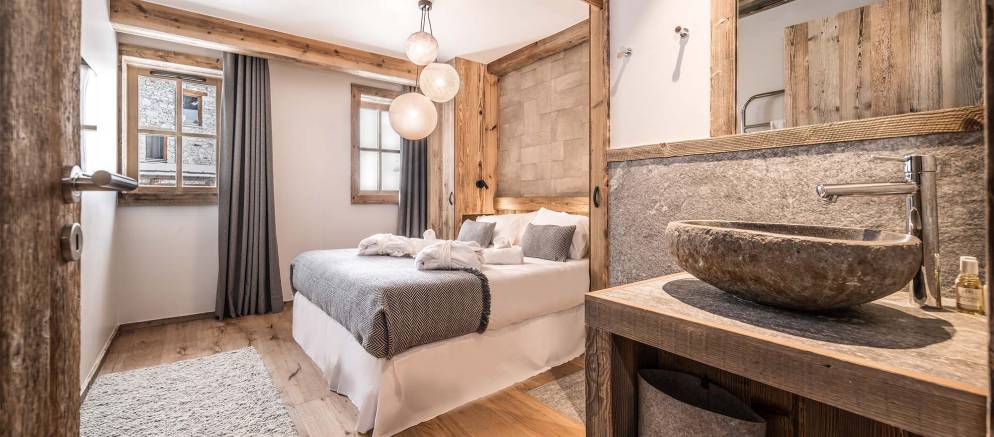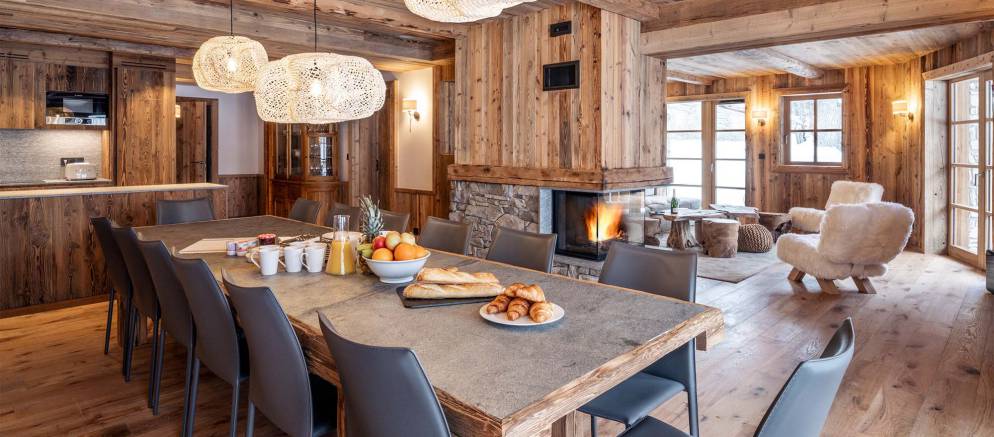 Inside, traditional design has been fused seamlessly with contemporary detailing and amenities. The large open plan living and dining room is separated by a glass fronted wood burning fireplace. The dining table can accommodate 14 and is overlooked by the kitchen. Outside, the hot tub is beautifully positioned on the terrace overlooking the Isère river and offers views of the village.