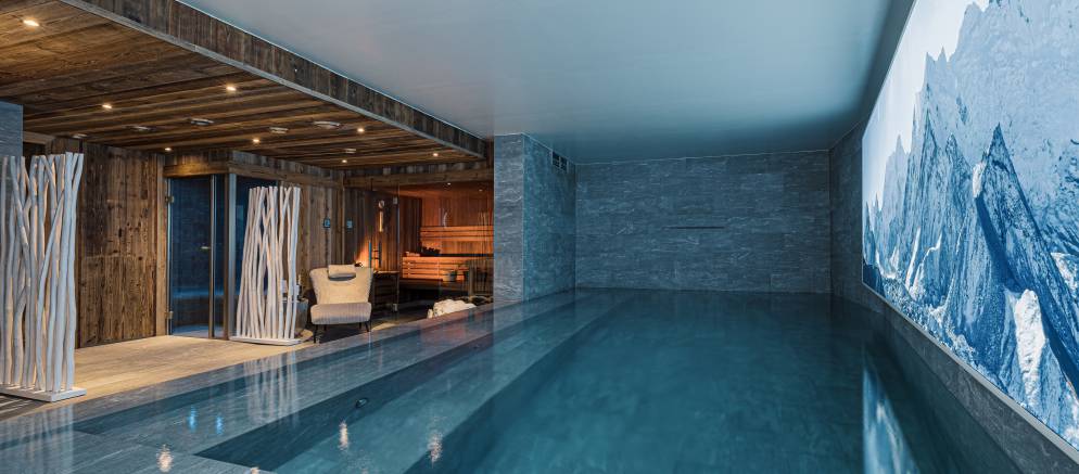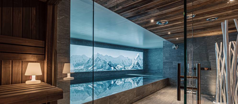 Above the living room is the added joy of a mezzanine floor with an incredible view of the old village of Le Fornet. This space is designed for entertainment with a TV lounge and pool table. Meanwhile, the lowest floor of the chalet is dedicated to relaxation with an extensive private spa area. There is an indoor swimming pool, Jacuzzi, sauna, steam room, gym and Italian style shower.