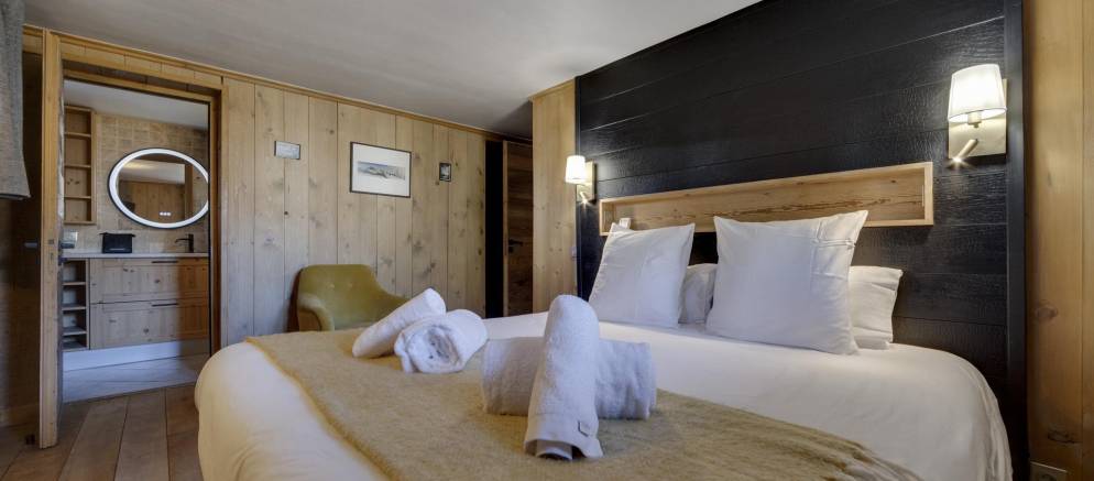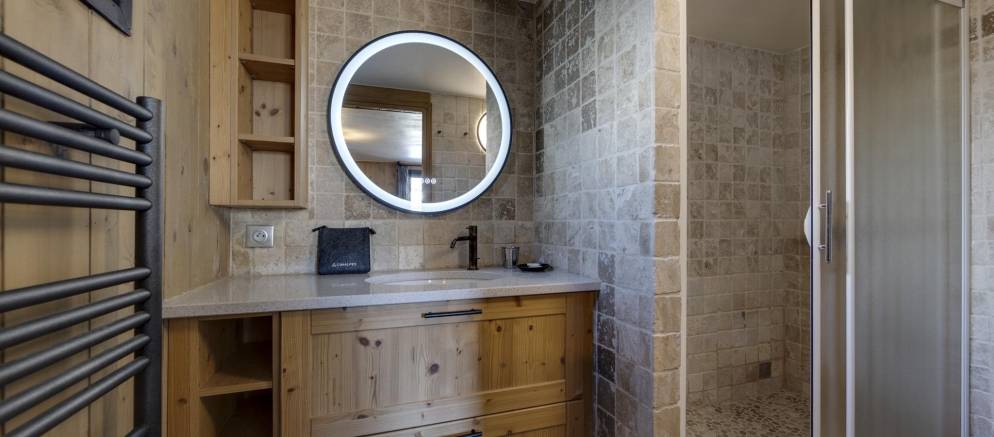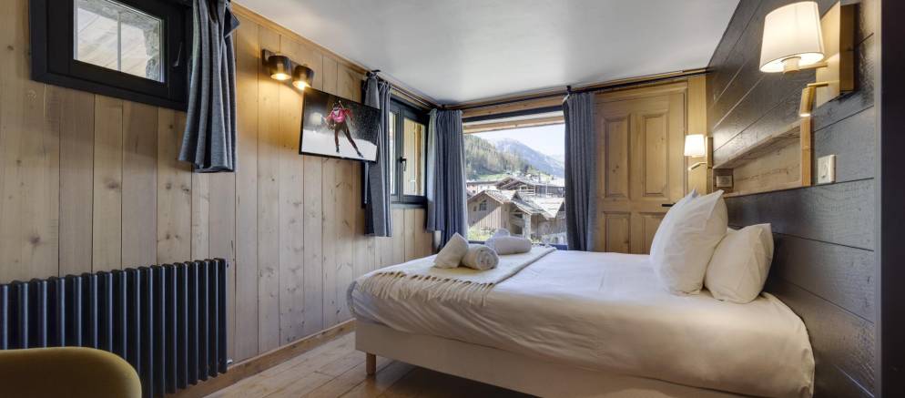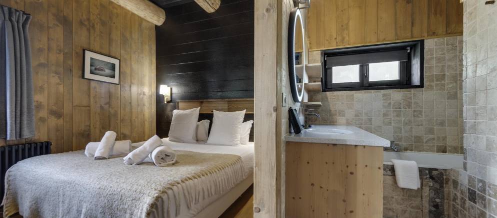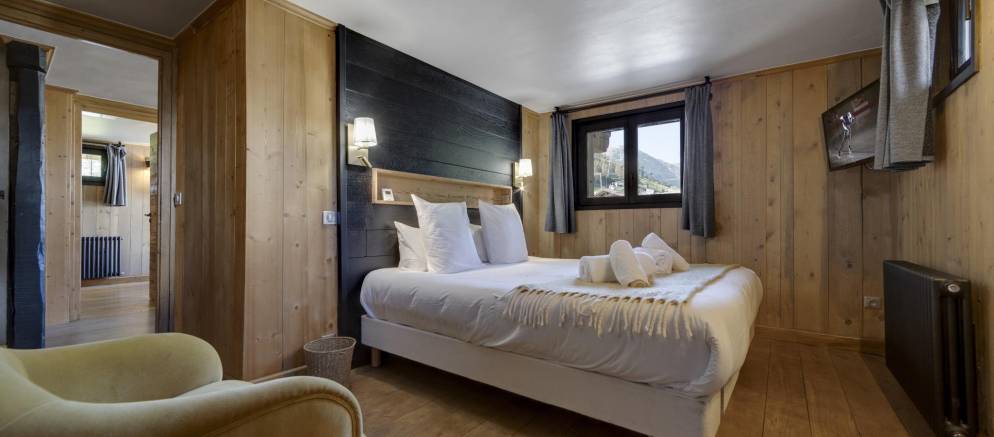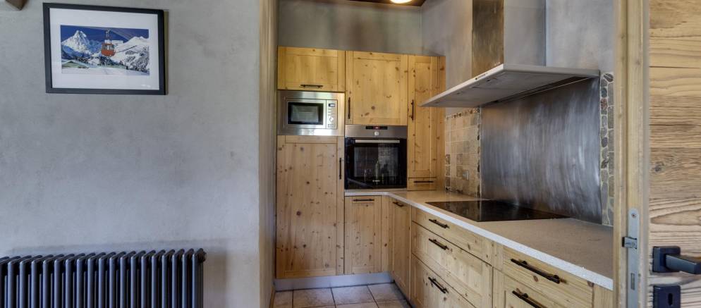 The open plan wood panelled living area is cosy and well furnished with comfortable seating, fireplace and large windows leading out onto a balcony with wonderful views. The kitchen is well-equipped with everything you need to enjoy to prepare home cooked meals in the evenings, or alternatively the numerous restaurants of Val d’Isère are only a short walk away.