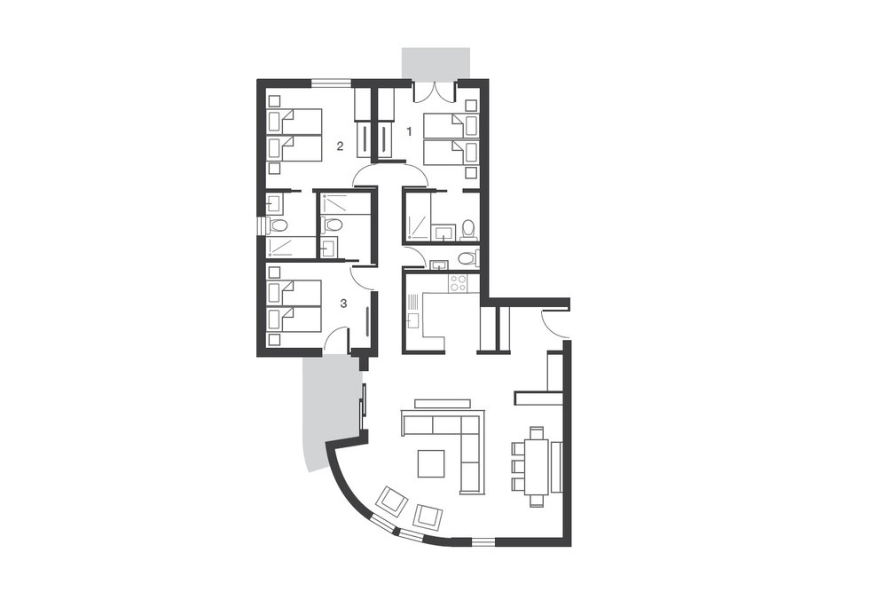 No 3 Aspen House, situated on the second floor of the residence, accommodates six guests in three bedrooms all featuring en-suite shower rooms. The open plan living / dining area with cutting-edge dancing fire provides ample space for family or friends to relax after a day on the mountain.