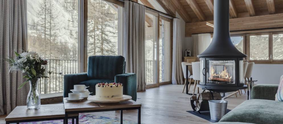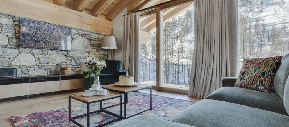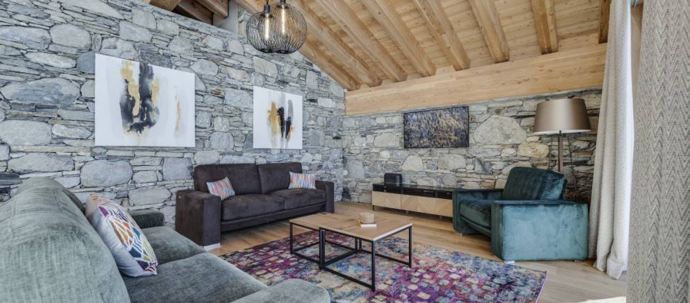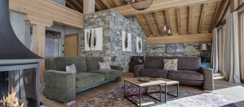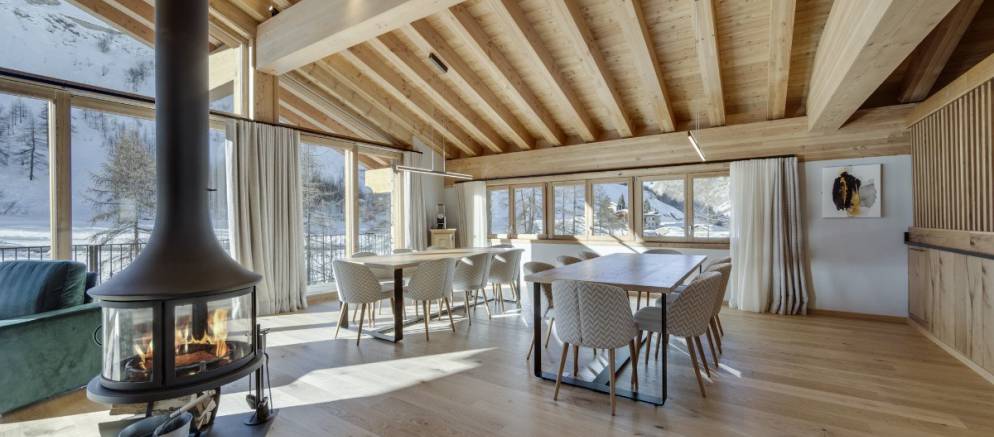 The top floor is entirely open plan with a stunning living and dining area all comfortably furnished with large sofas, log fireplace, vaulted ceiling, and floor to ceiling windows boasting spectacular views. There is a large balcony, ideal for soaking up the afternoon sun.