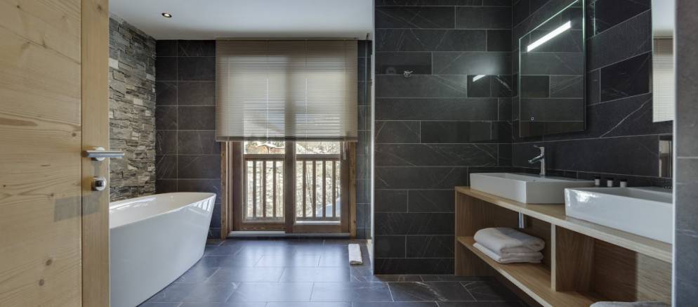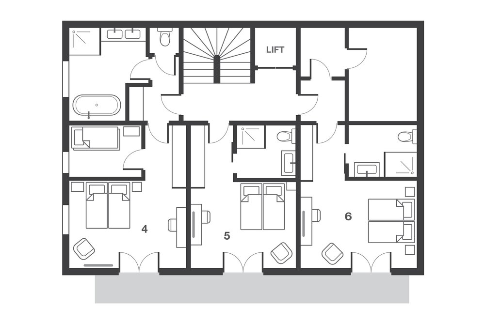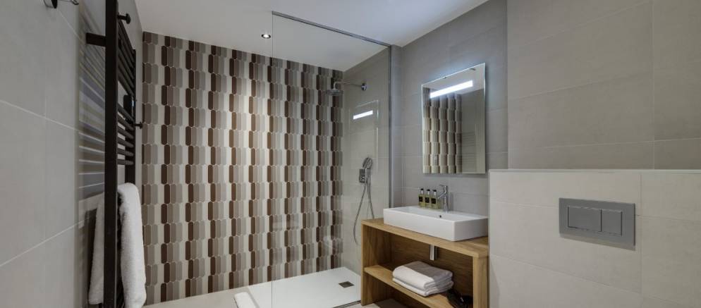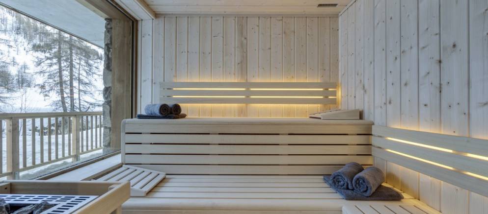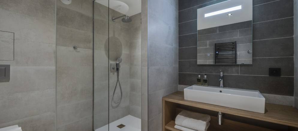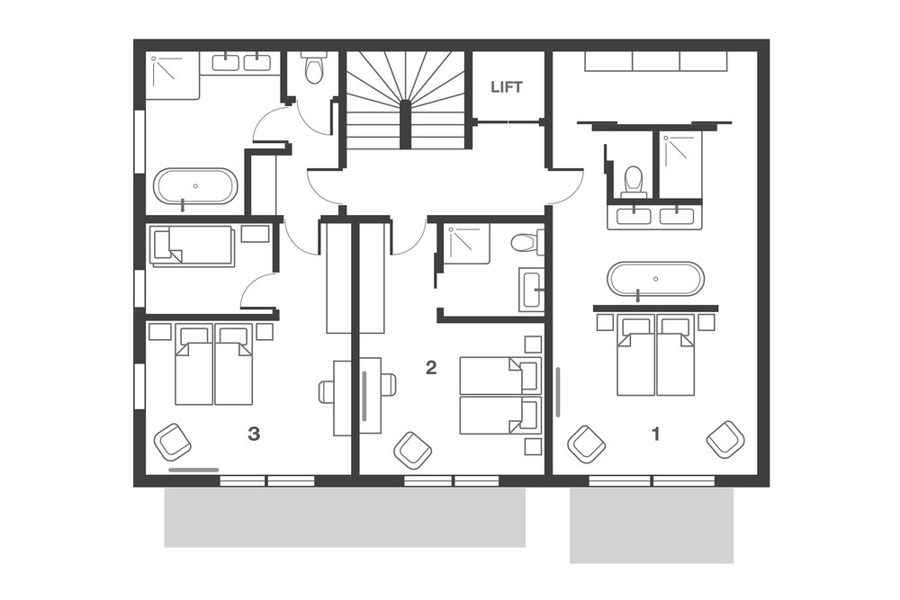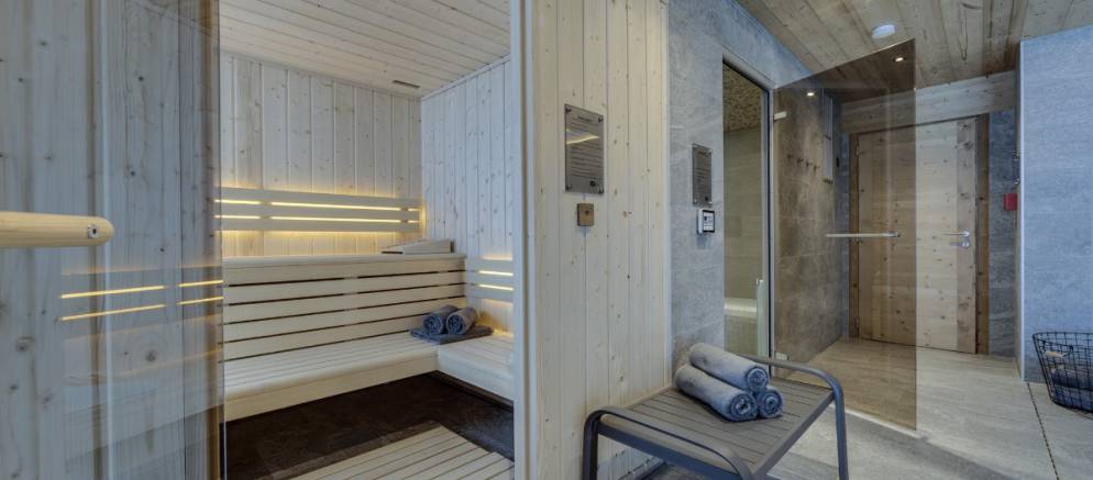 The lower three floors are accessed by stairs and a lift with the 7 en-suite bedrooms accommodating 14-18 people. All the rooms have balconies overlooking the forest and stream, along with space for a cot. Two rooms have additional bunk beds, charged at half the adult price. On the lower level you will also find the private indoor swimming pool as well as the sauna, hammam, and fitness room.