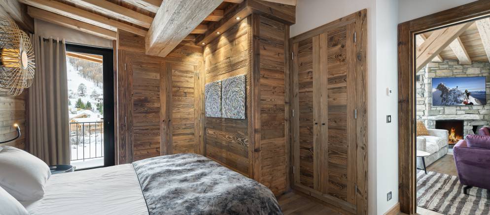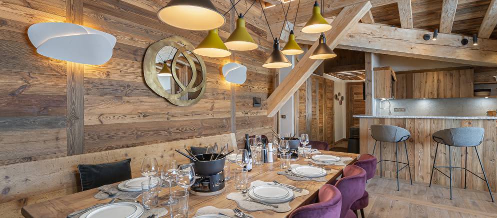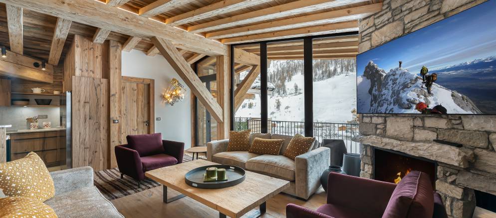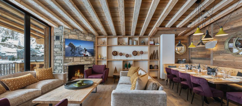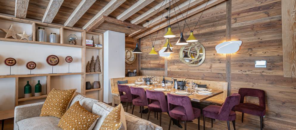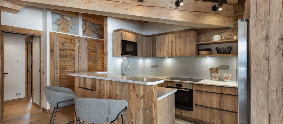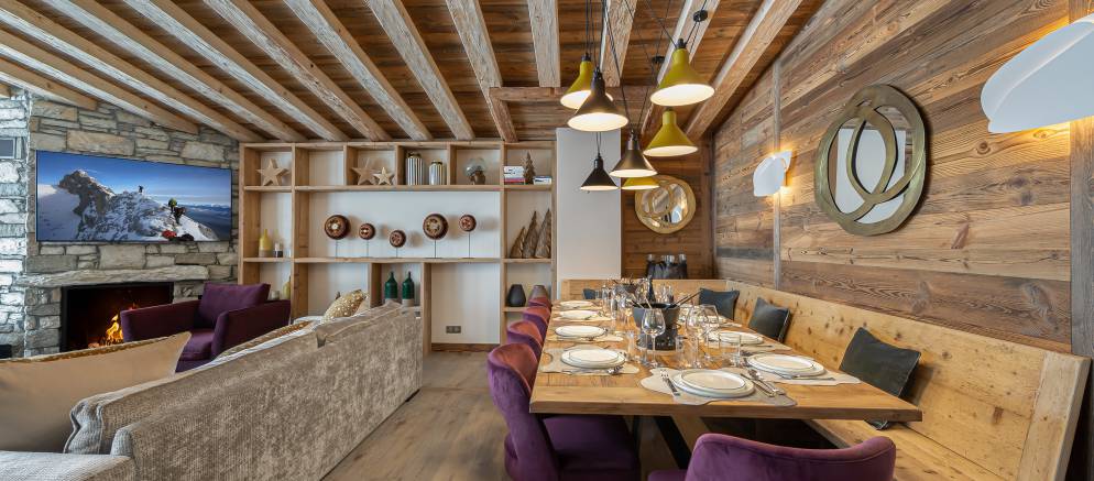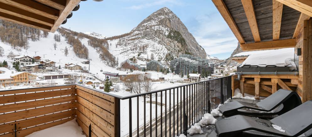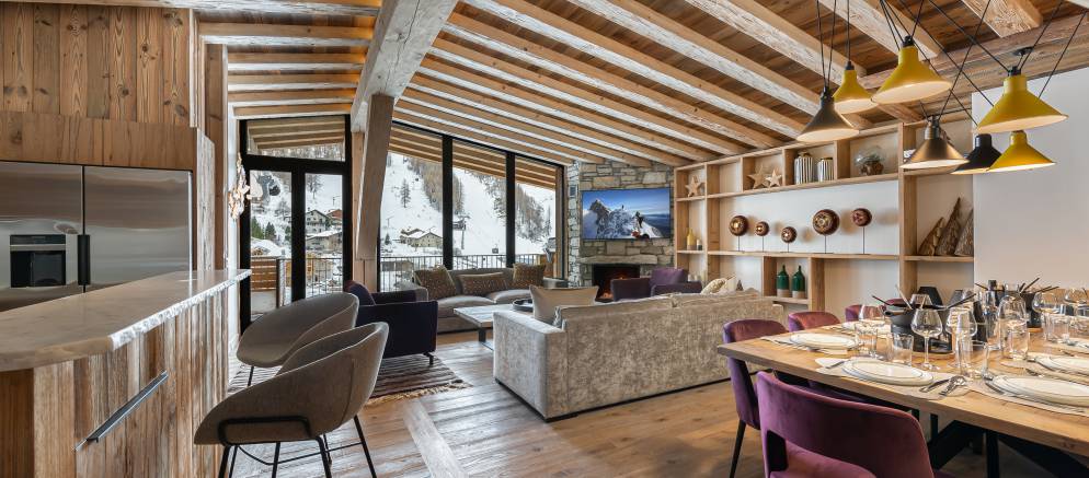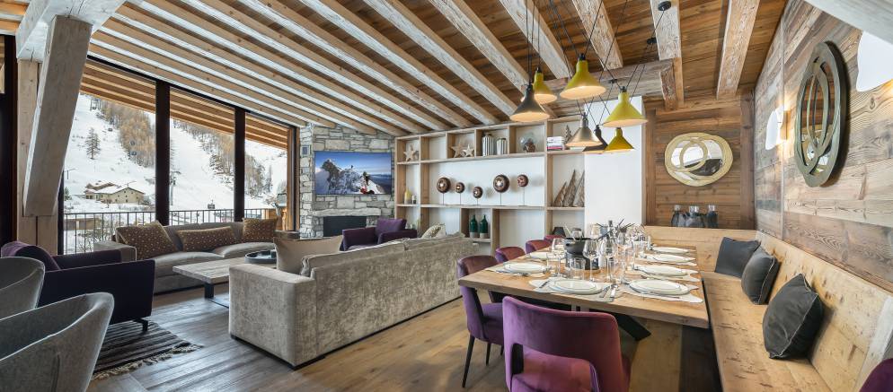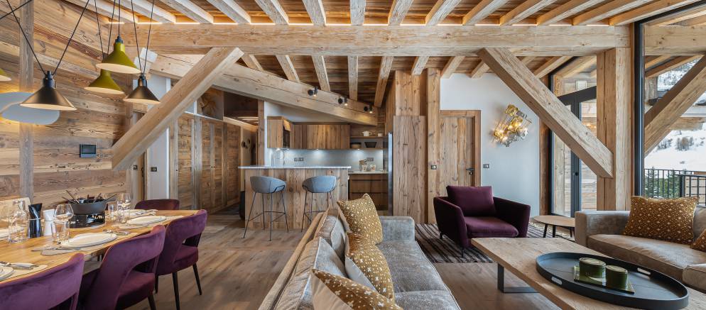 Penthouse Fleche is a stylish and spacious apartment in Val d’Isere, nestled on the 4th floor of a prestigious residence. The residence is located at the entrance of the resort in the La Daille area, which has a selection of bars and restaurants as well as a good-sized supermarket. Inside the apartment features wood ceilings and panelling, large picture windows and mix of traditional and contemporary design.