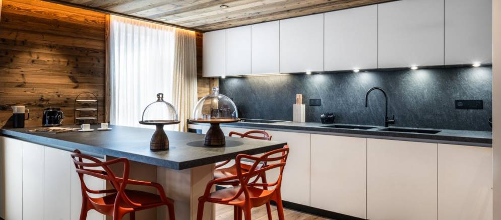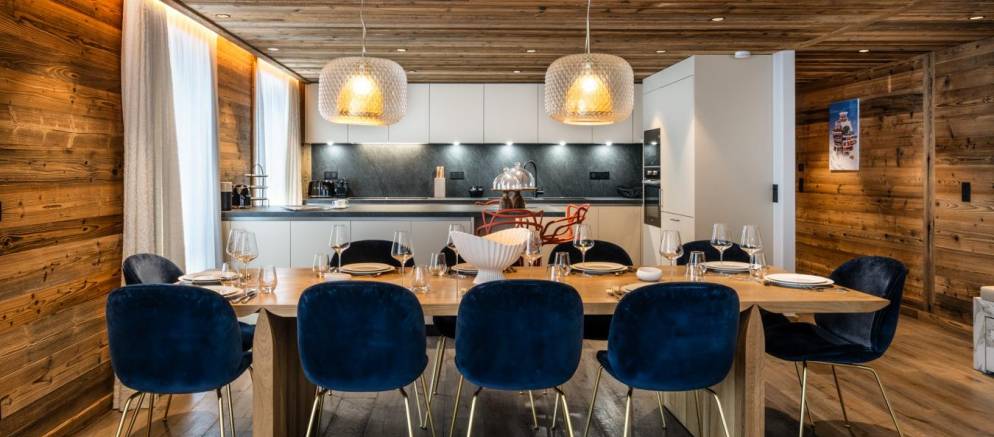 The lounge features an eclectic mix of sofas and armchairs, and the adjacent dining area has a table seating 10. The kitchen is fully equipped for home cooking and features a breakfast bar. Plentiful wood panelling and a gas fireplace add a cosy feeling. From the living room you can step out onto a terrace with outdoor hot tub and is the place to head to for some relaxing après ski.