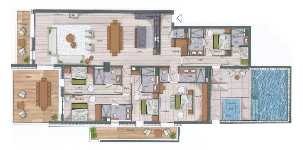 When it comes to the sleeping quarters there are five double bedrooms all with en-suite shower rooms and toilets. Some of the bedrooms also have terrace or balcony access. The sixth bedroom is a bunk room sleeping 2 and has an en-suite shower and access to a separate toilet in the apartment. The bedrooms have been decorated with plenty of wood and muted colours, whilst the shower rooms are sleek and modern.