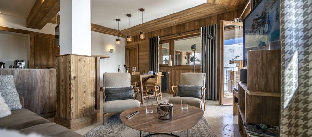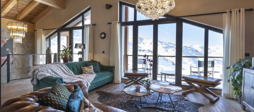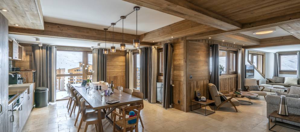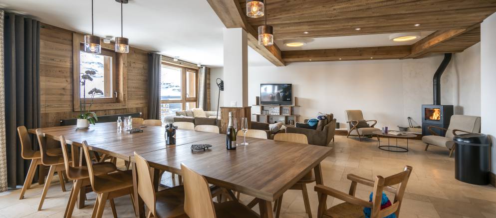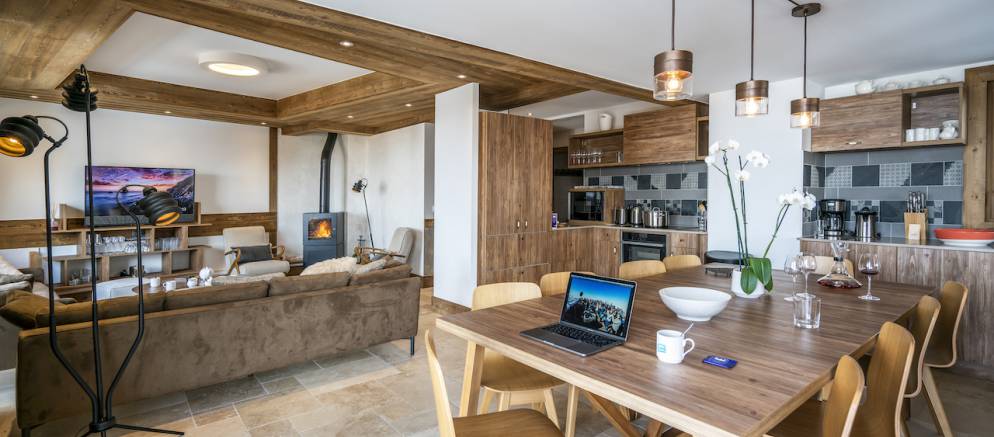 There are two main entrances, one through the garage on the ground floor and another on the second floor, the main living level. The living room is extremely spacious, modern and comfortable with a beautiful fireplace and access to the outside terrace. The south facing 150m2 terrace overlooks the Val Thorens, the Glacier de Péclet and mighty Cime de Caron mountain.