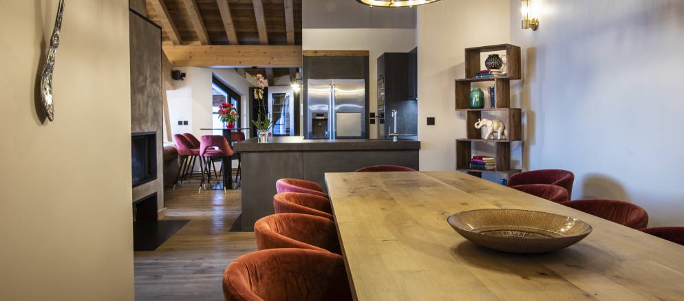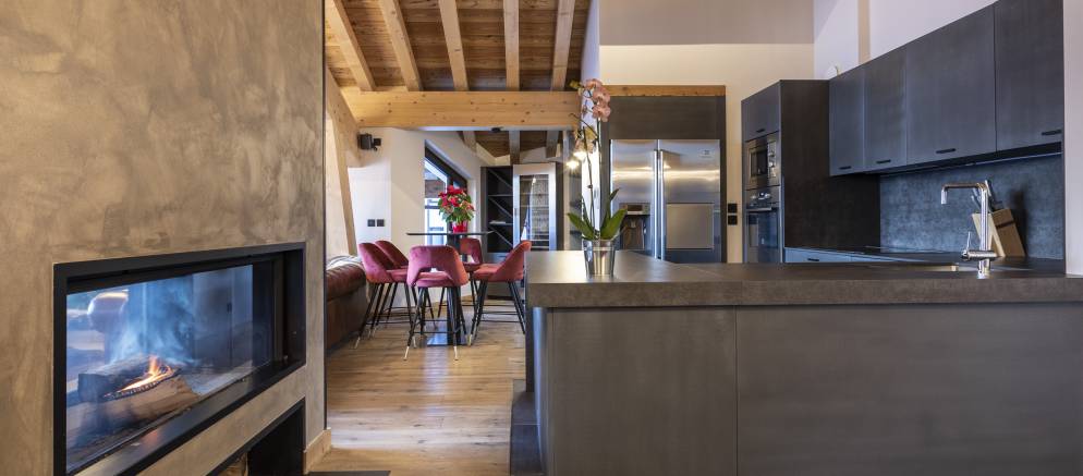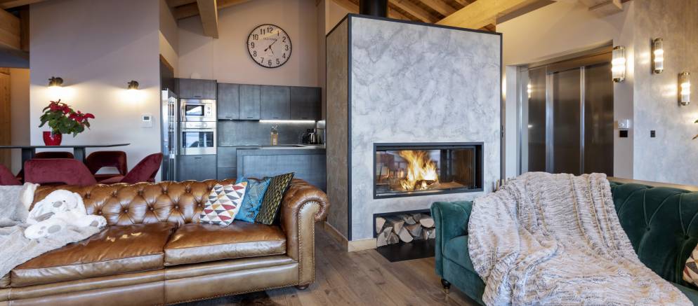 The entire top floor of the chalet is given over to open plan living. This impressive space has plenty of room for friends and family to enjoy quality holiday time together. The well-equipped kitchen has all you need to cook up wonderful meals while the adjoining dining area has a large table that easily seats 10. The living area has plenty of comfortable seating and takes full advantage of the views. Enjoy relaxing by the fireplace, or step outside onto the south facing balcony and enjoy the panorama of snow covered mountains.