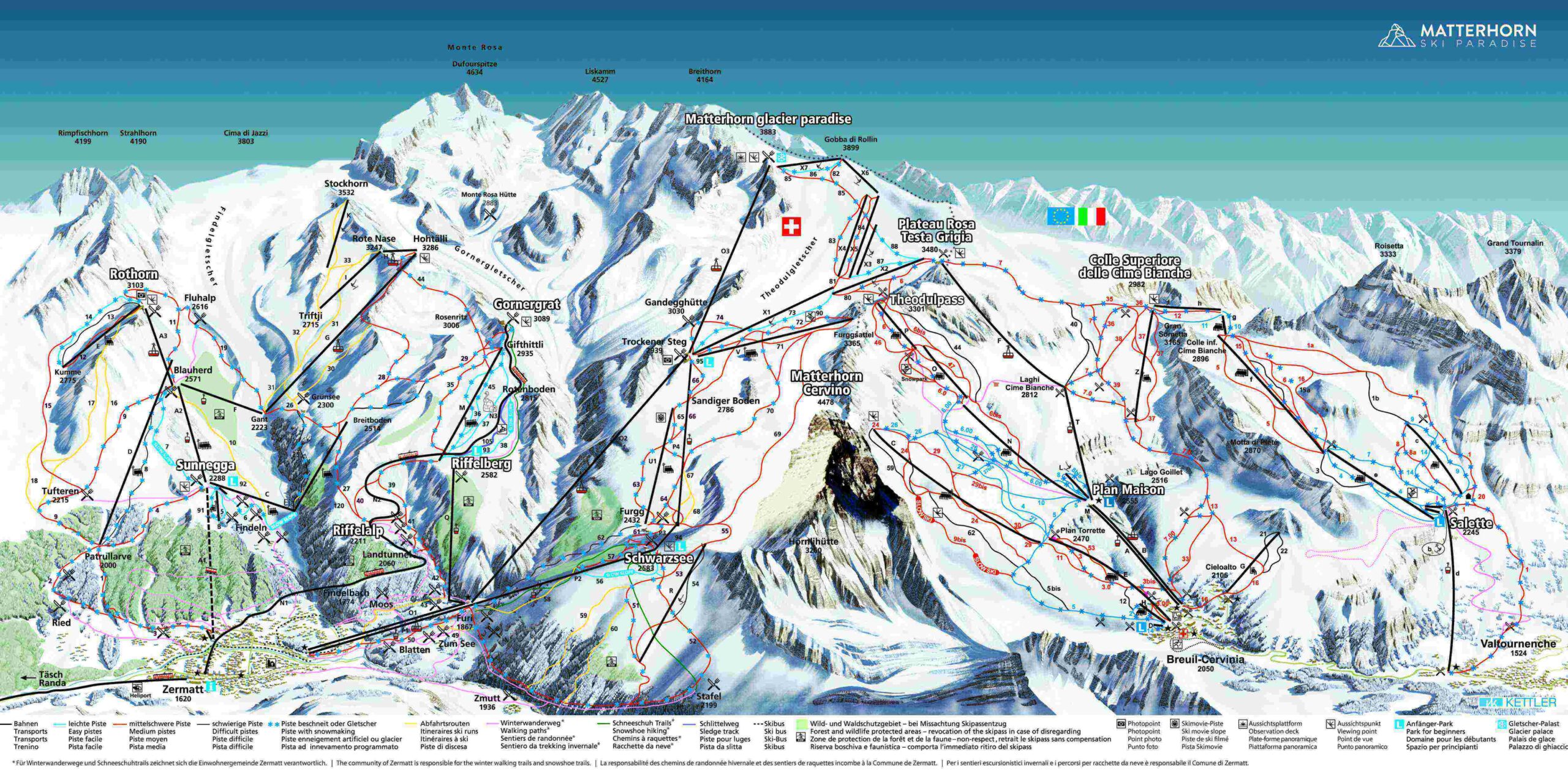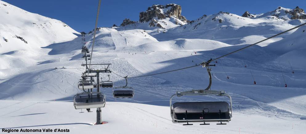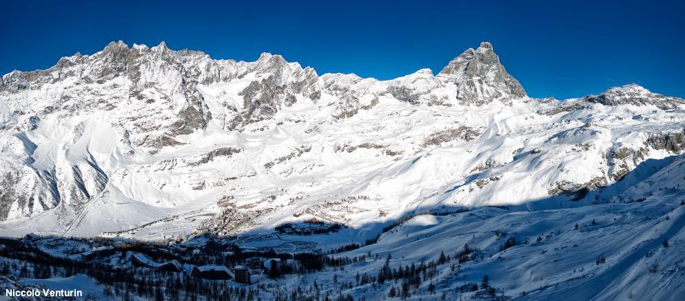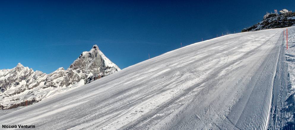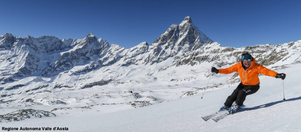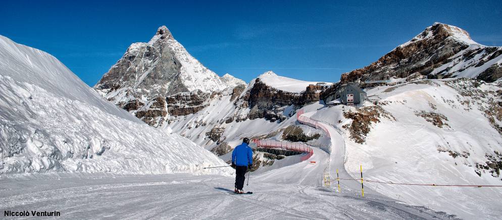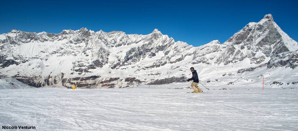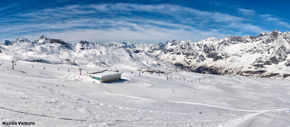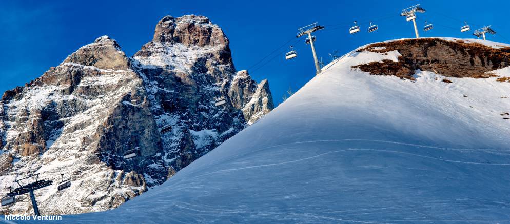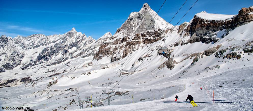 The ski area is called the Cervino Ski Paradise and is defined by three sectors, Breuil-Cervinia and Valtournenche on the Italian side, and Zermatt on the Swiss side (Matterhorn Ski Paradise). The area is connected by a vast network of slopes and lifts that allow you to ski all day without ever having to take your skis off. The main slopes above Cervinia are high and open, and mainly west-facing. The vast majority of the ski lifts are modern and fast, meaning lift queues are a rarity.