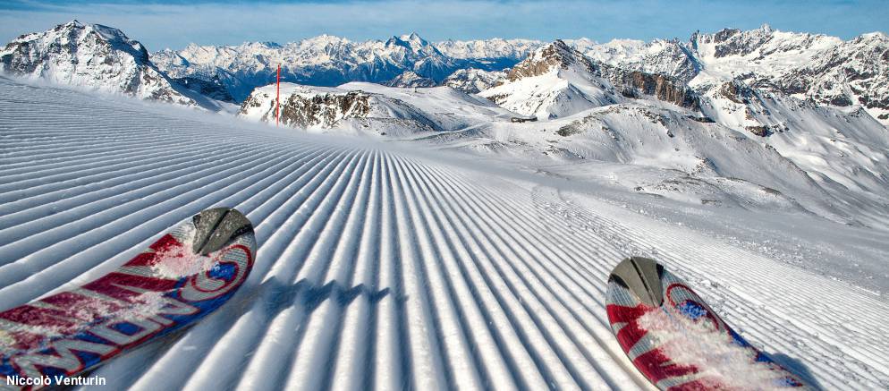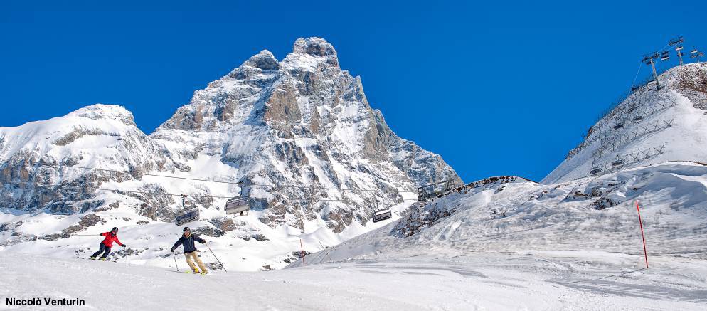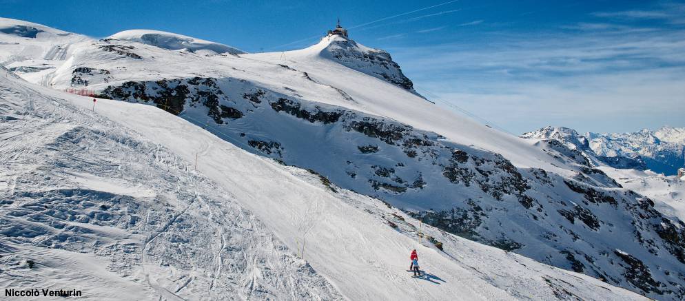 High altitude and sunny skiing with stunning scenery, Cervinia is a paradise for intermediate skiers.