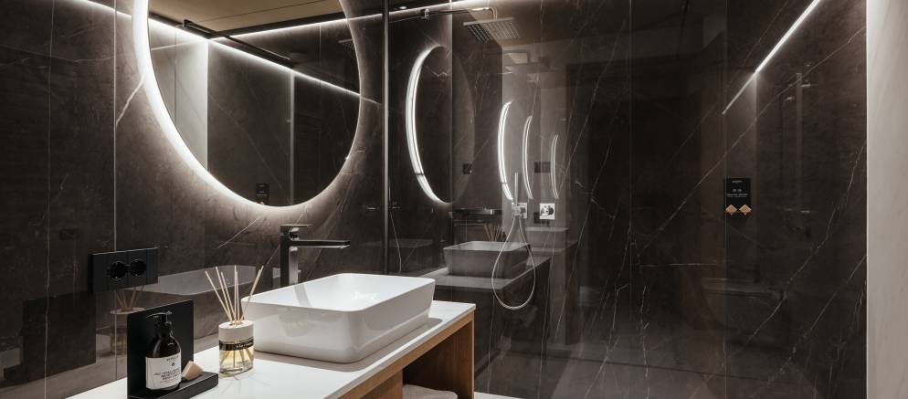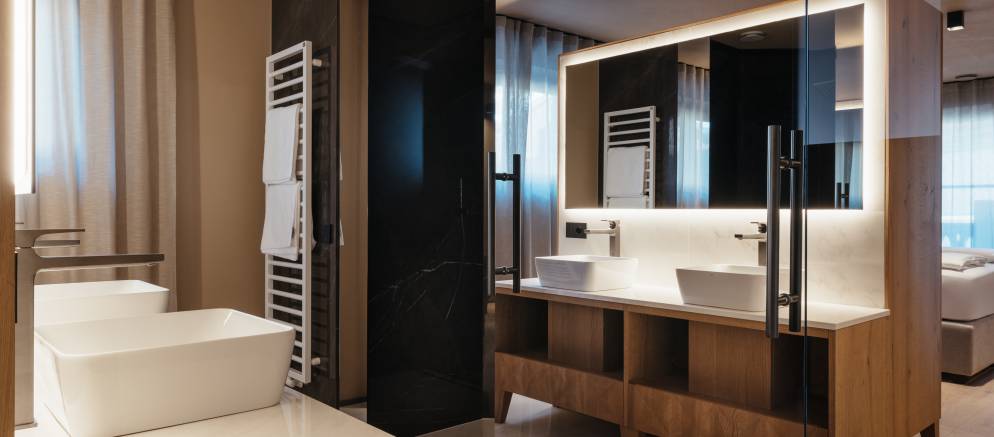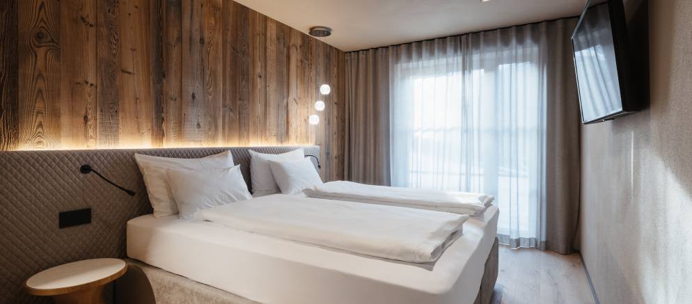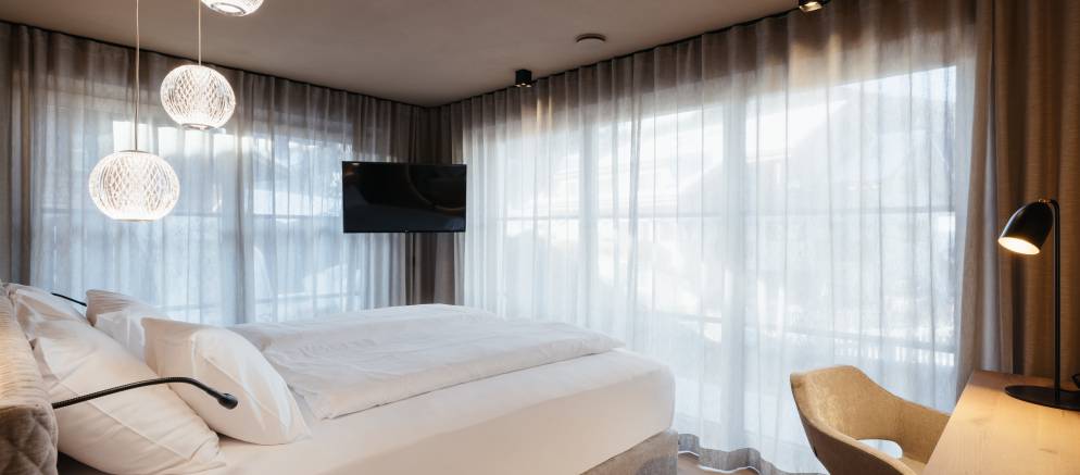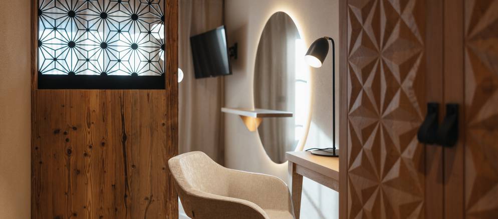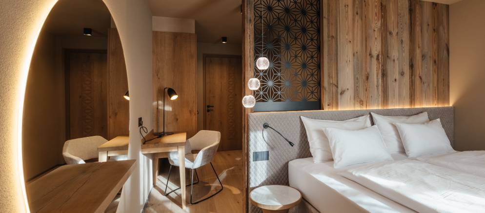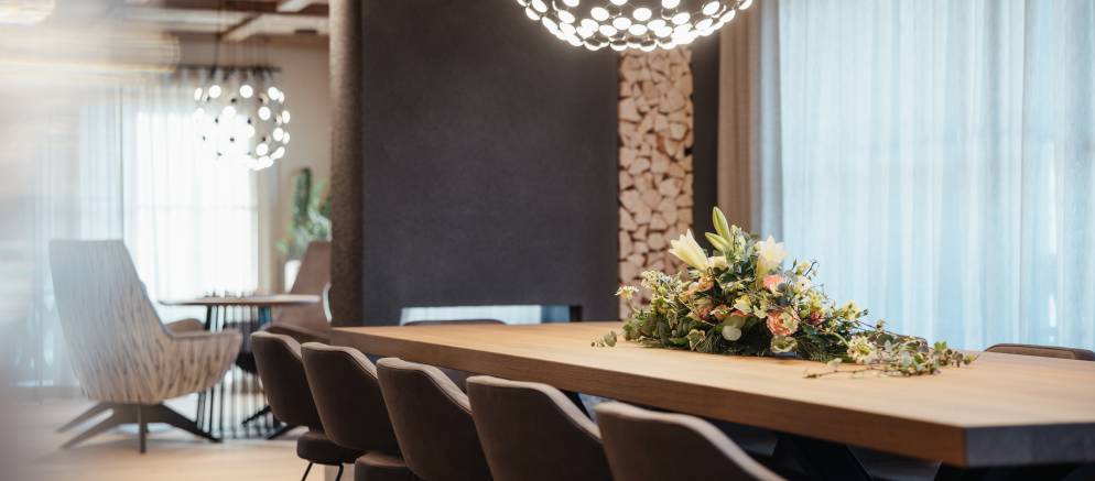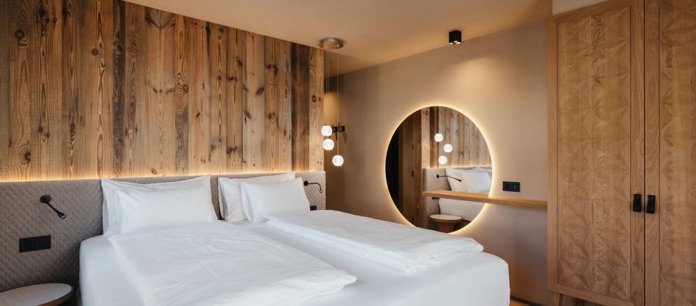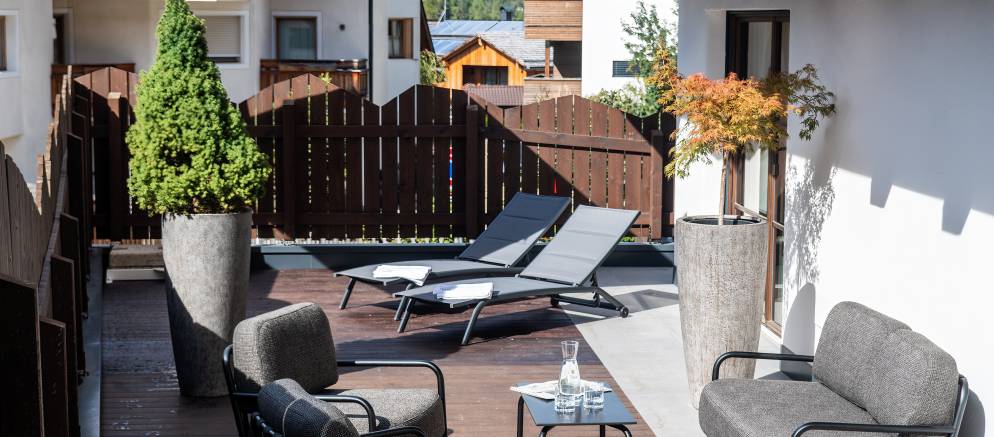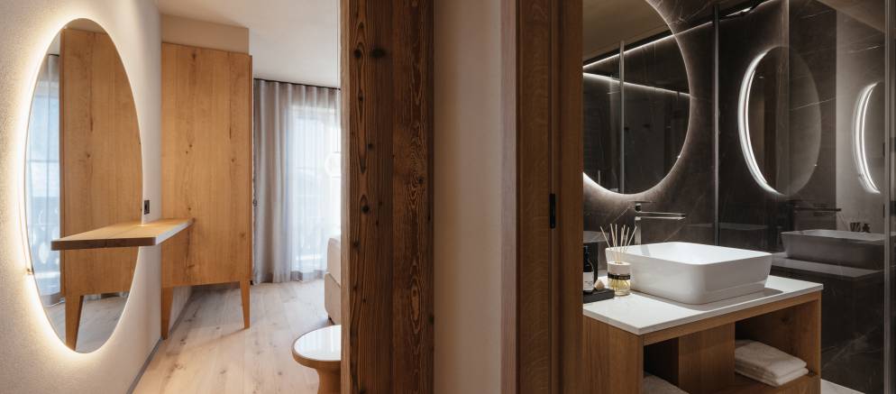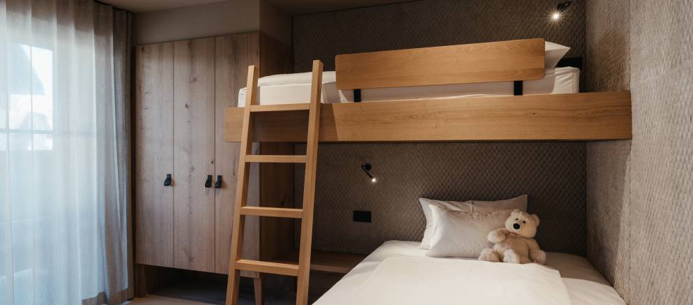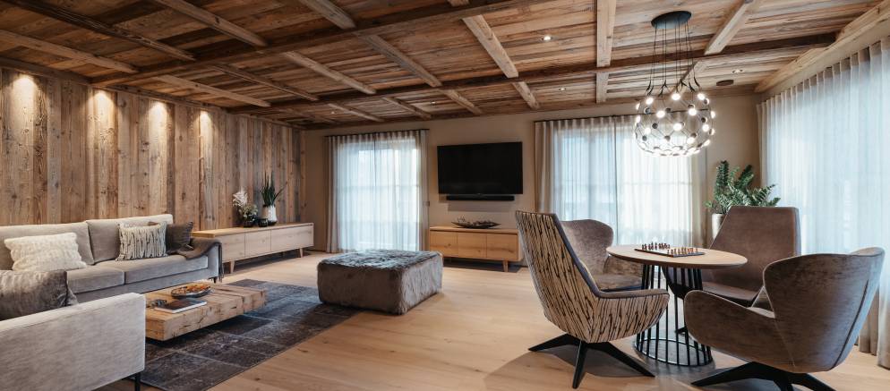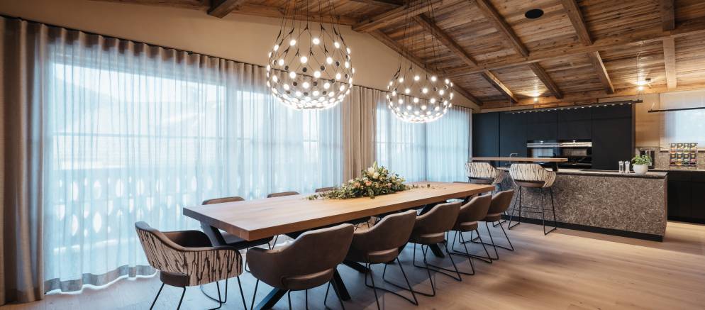 At the top of the chalet are the living spaces with the floor divided into two distinct areas, one for convivial dining and one for relaxing. Large windows flood both rooms with natural light and the balconies offer views onto the Marebbe Dolomites. The living room has two seating areas, one with a large L-shaped sofas and the other with armchairs set around a table and perfect for board games.