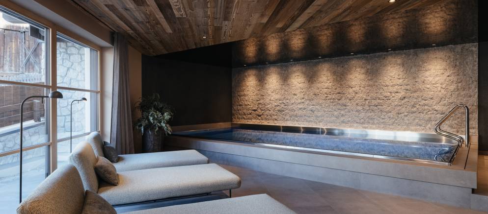 The tranquil wellness area is dominated by the indoor swimming pool with counter current swimming and chromotherapy lighting. After a dip in the pool, you can choose between the Finnish sauna or simply relax on the chaise longues in the relaxation lounge. Your holiday practicalities have also been considered with a utility room equipped with washing machine, dryer, iron and ironing board.