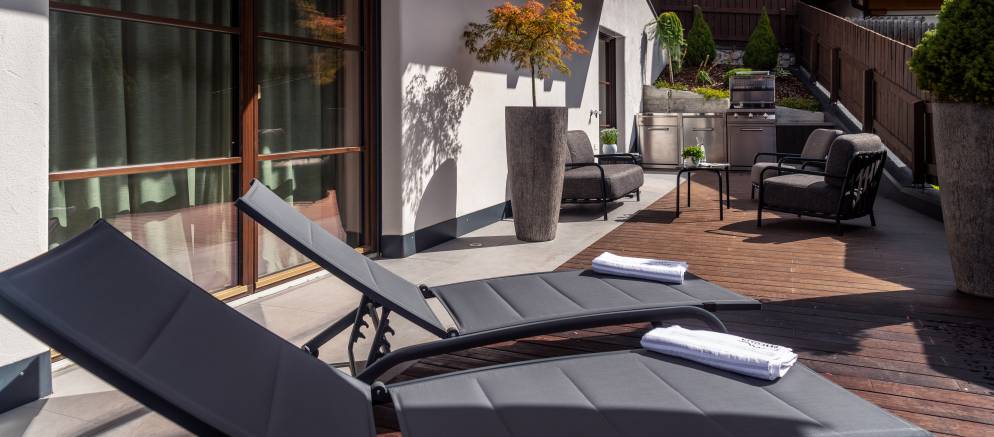 The ground floor offers a mix of bedrooms, spa facilities, outdoor spaces as well as the main entrance with storage for your mountain coats. The final two bedrooms of the chalet feature king-size double beds, en-suite shower rooms and access onto the terrace. The terrace is equipped with parasols, sunbeds and sofas available for outdoor relaxation, as well as an outdoor kitchen and barbeque available for al fresco dining in the summer.