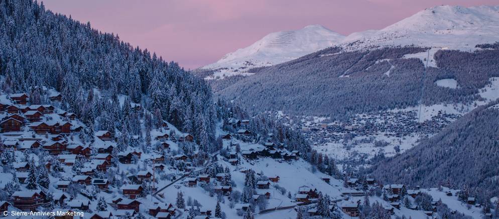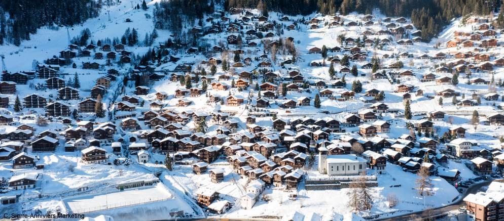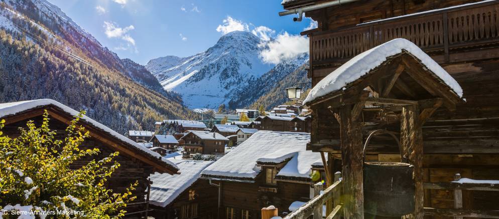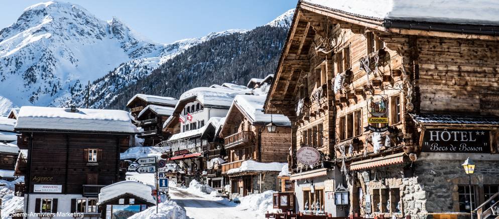The Val d’Anniviers is an Alpine valley home to numerous villages including the ski resorts of Grimentz, Zinal, St-Luc, Chandolin, and Vercorin. Three separate ski areas – Grimentz-Zinal, St-Luc/Chandolin, and Verorcin – offer a total of 210km of pistes. The three areas are connected by road and can be accessed either by car or the ski bus in the winter season.