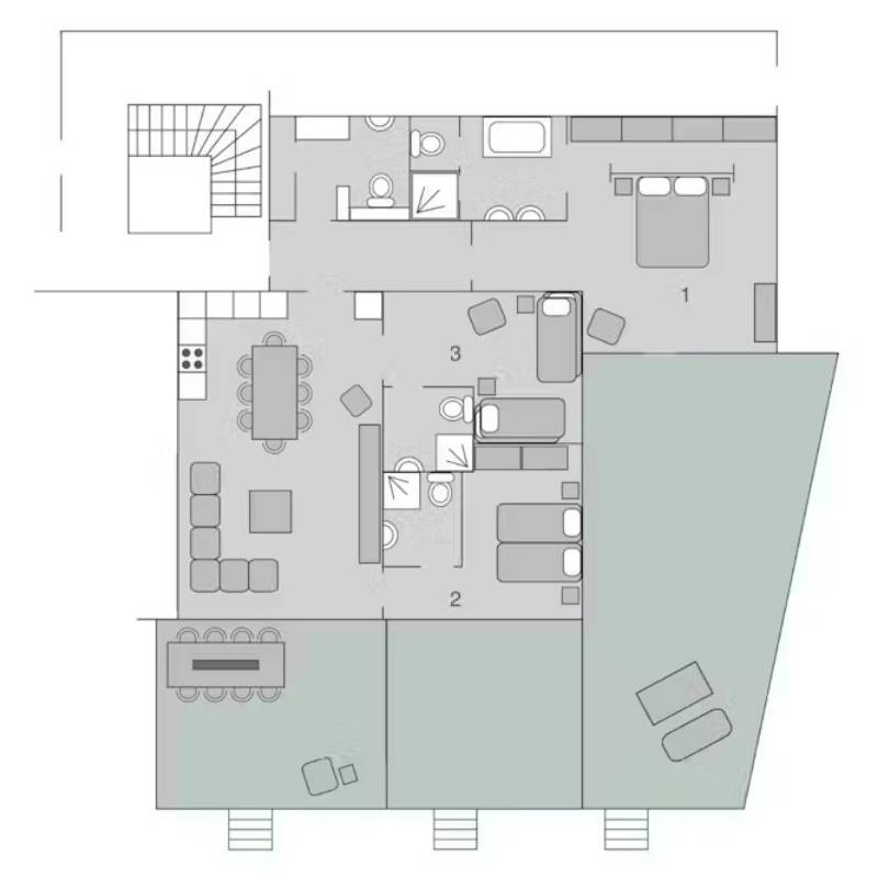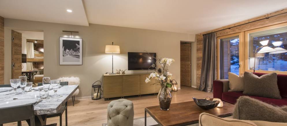 Throughout the apartment is a modern yet chic alpine feel, with a stunning open plan sitting room, dining room and kitchen. Large picture windows give beautiful views to the alpine garden which can also be admired from the sunny and spacious south-facing terrace. All three bedrooms benefit from their own en-suite bath or shower rooms.