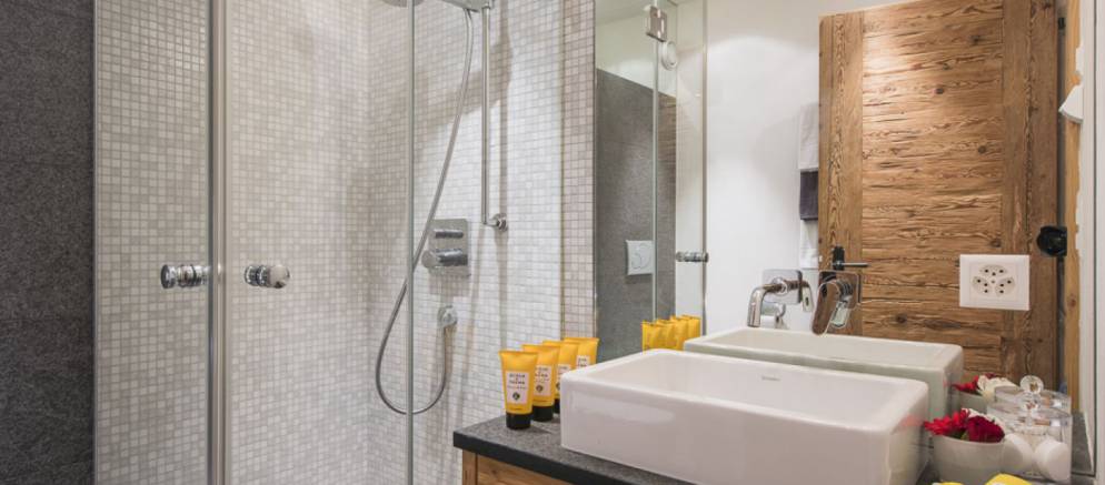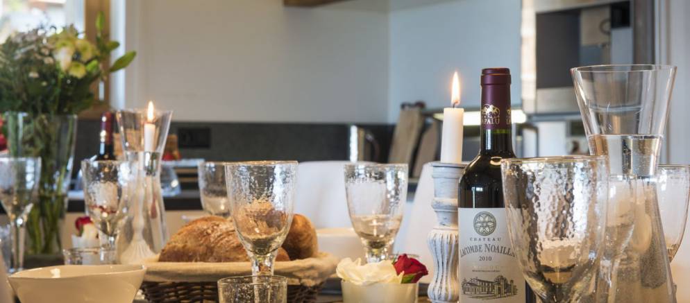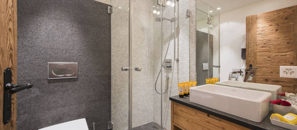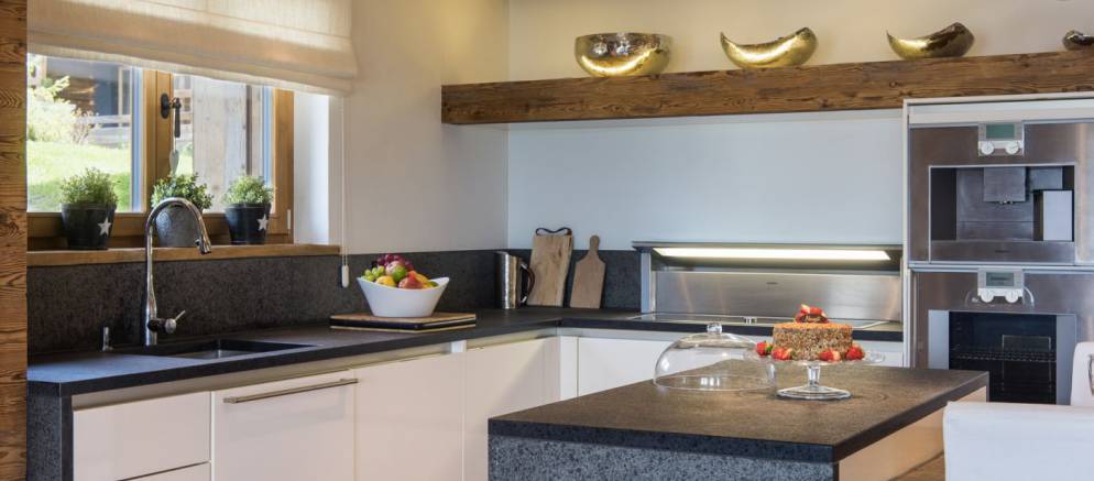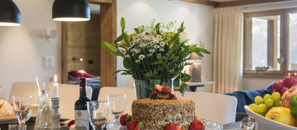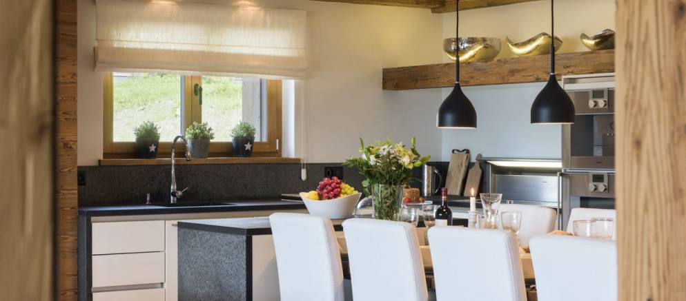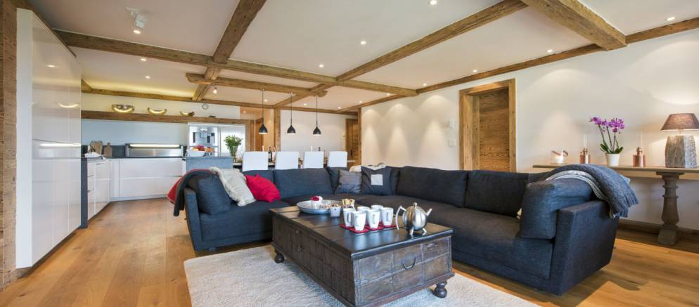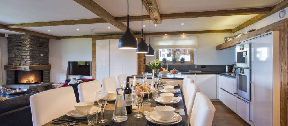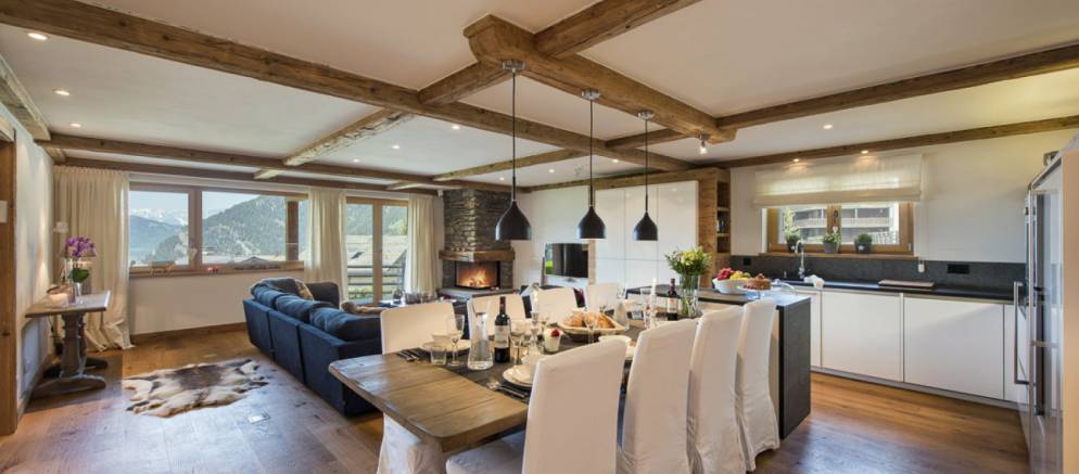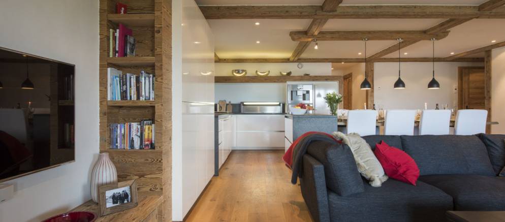 You enter to a large open-plan living and dining area complete with wood burning fireplace. Modern, chic furnishings are blended with authentic woods and timbers creating a stylish, alpine apartment.