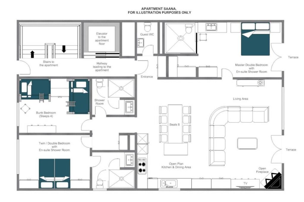 Positioned in arguably one of the best locations in Verbier, you can also ski back to within 200m of the apartment. The apartment is set out over one floor and has three bedrooms all with en-suite or private shower rooms.