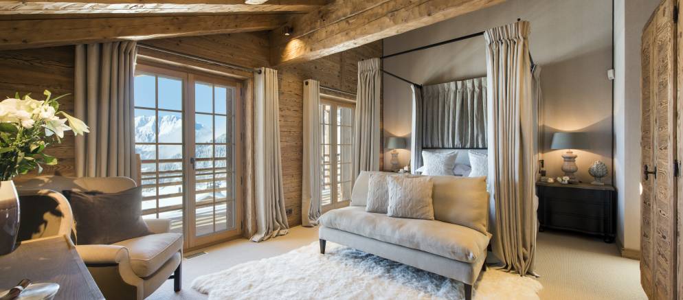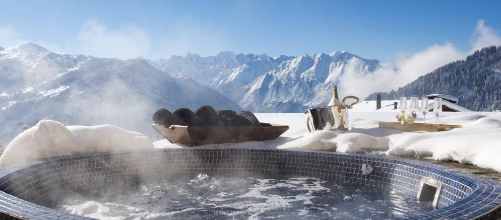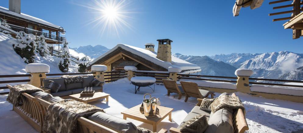 With its uninterrupted views of Mont Blanc Massif, Chalet Chouqui has a large terrace with al fresco dining for 20, plus sofas and sun loungers, a sunken outdoor hot tub and vast fire pit with BBQ rack.