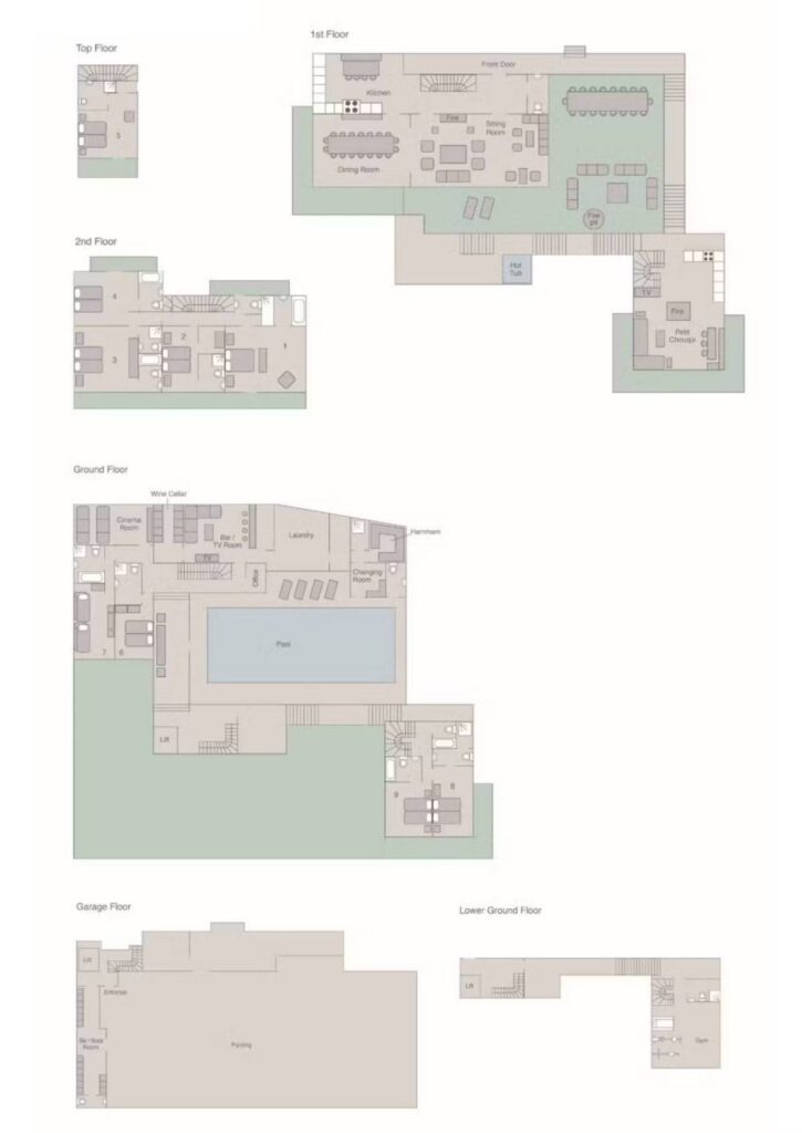 Designed and furnished by a leading London interiors specialist, the two sitting rooms and nine bedrooms are decorated with herringbone tweeds, faux fur throws and feature reclaimed wood and custom-made English furniture. There is state-of-the-art John Cullen lighting and a Sonos music system throughout as well as a bar with an impressive adjoining wine cellar.