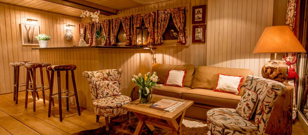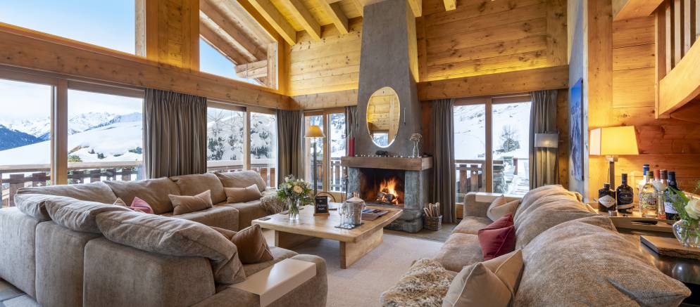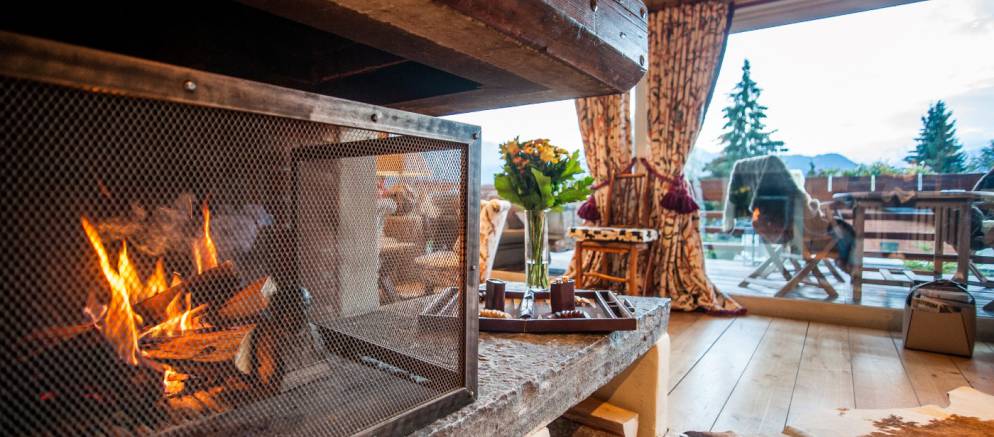 The comfortable and tasteful living room has its own bar and a traditional Swiss fireplace for a hot crackling fire. A spacious terrace, complete with a comfortable seating area and a small dining table, allows guests to get cozy under faux-fur blankets and enjoy the mountain sunsets, or watch the stars twinkle after a delicious dinner.