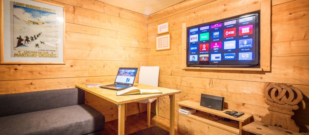 The chalet’s modern amenities include a large flat-screen TV with international cable channels and DVD player in the living room; TVs with cable channels and DVD players in most of the bedrooms; WiFi connection throughout the chalet; Apple TV movies; an iPod station and Wii; as well as a sauna and separate shower room.