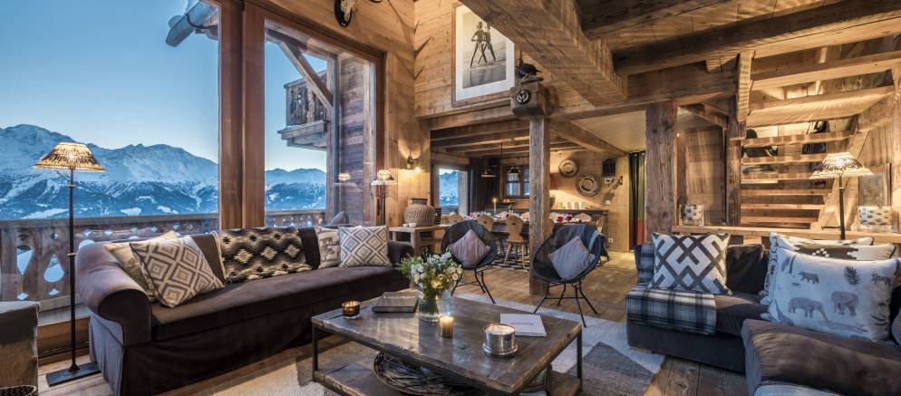The main living room has a dramatic double height ceiling and is furnished with worn leather sofas and distressed wooden furniture. There is a stylish mix of alpine detailing, African artwork and carvings.