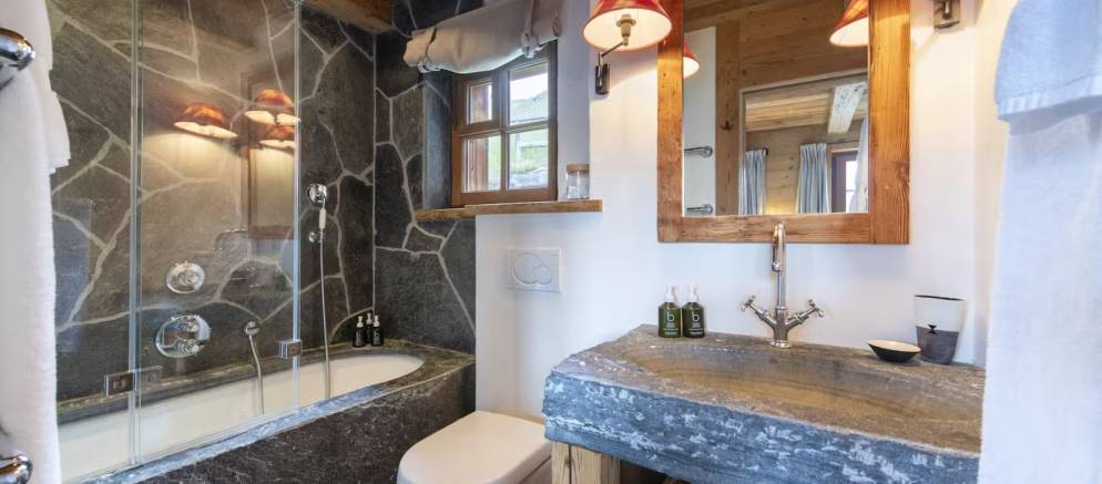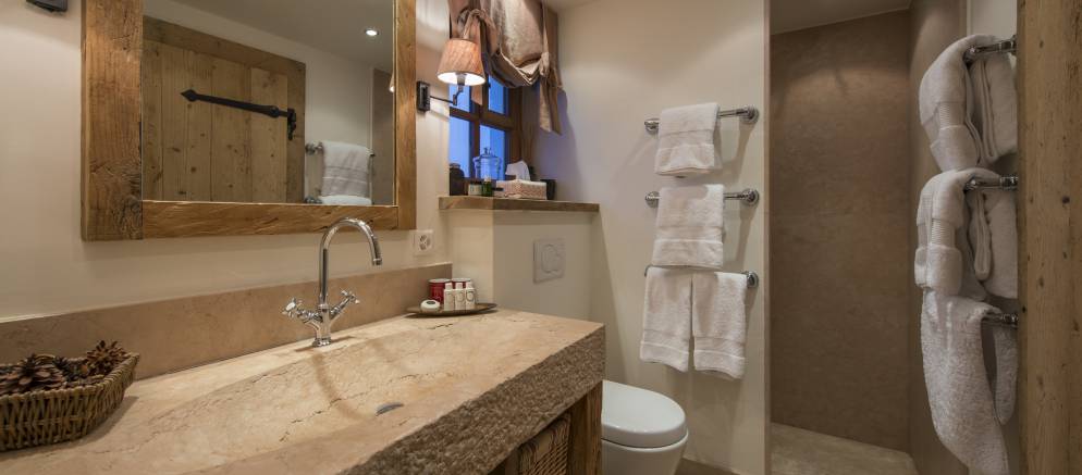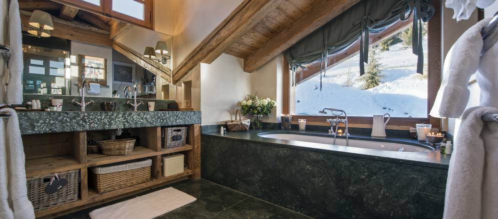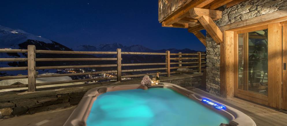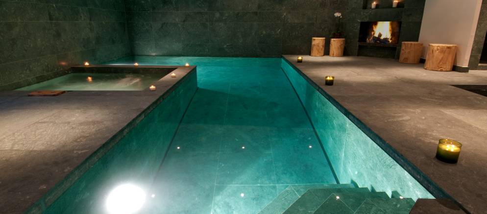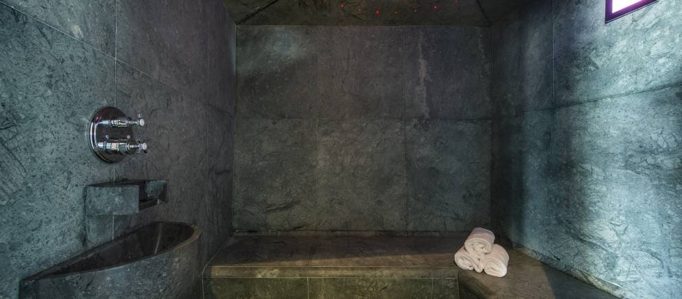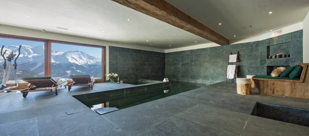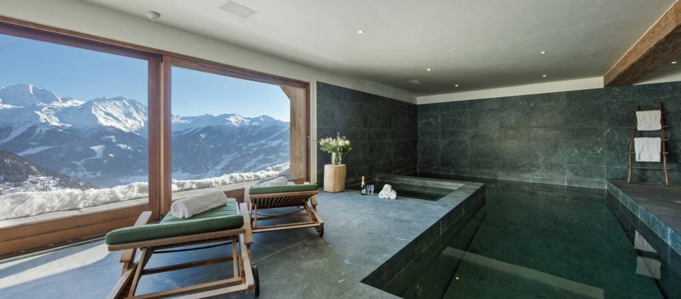 The chalet boasts a magnificent spa with swimming pool, indoor hot tub, Hammam, sauna and plunge pool. Finished in stunning Italian marble, the commanding views across the valley and the mountains beyond can be admired through the sliding glass doors that open up to the terrace with outdoor hot tub.
