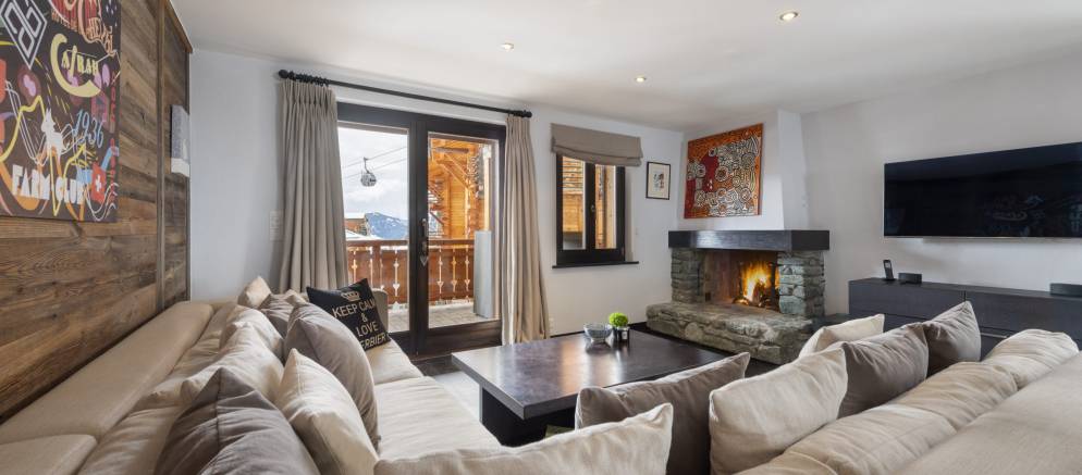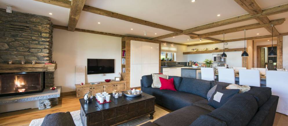 Moving upstairs, the first floor is home to the wonderful open plan living and dining area. Floor to ceiling French windows open out onto the large wrap-around terrace, the perfect spot to sit back and watch the sun go down. In the evening enjoy a glass of champagne in front of the roaring fire whilst the bright lights of Verbier create a spectacular backdrop.