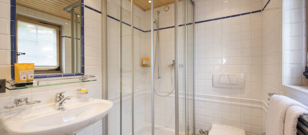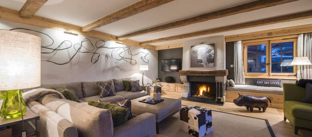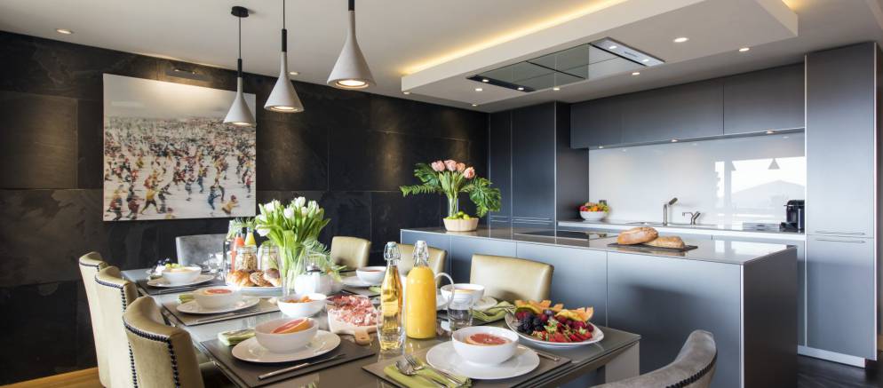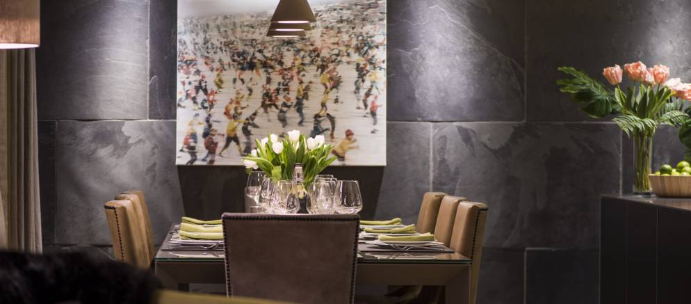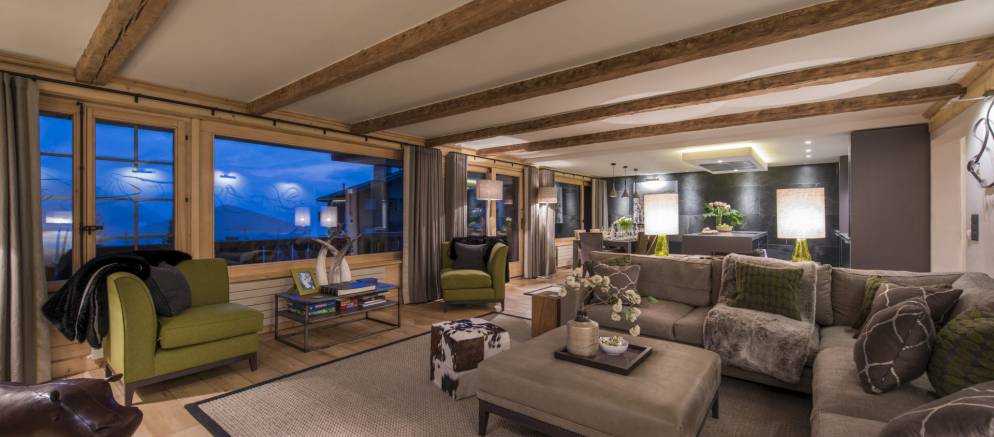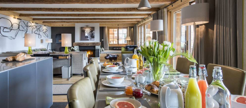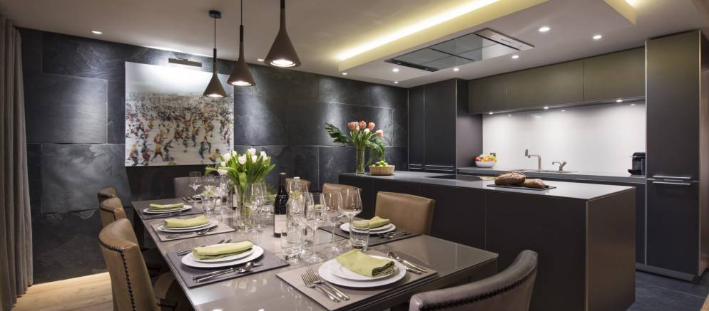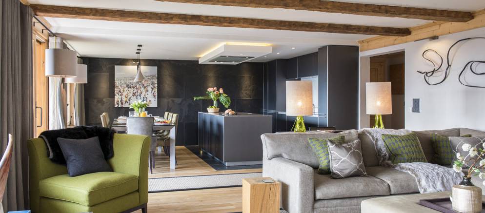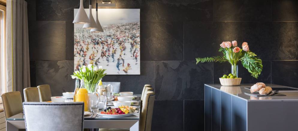 On entering the apartment, you arrive into the spacious open plan living spaces. The well-equipped and sleek kitchen overlooks the modern dining table that comfortably seats 8., whilst the living area is very welcoming with a large L-shaped sofa and armchairs focused on the stone fireplace. This is the perfect spot for cosy nights in whilst the snow is falling outside.