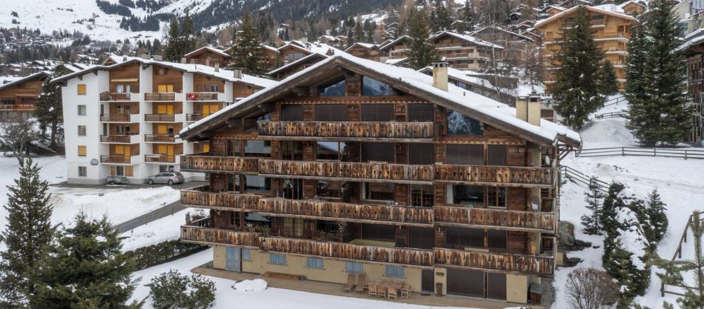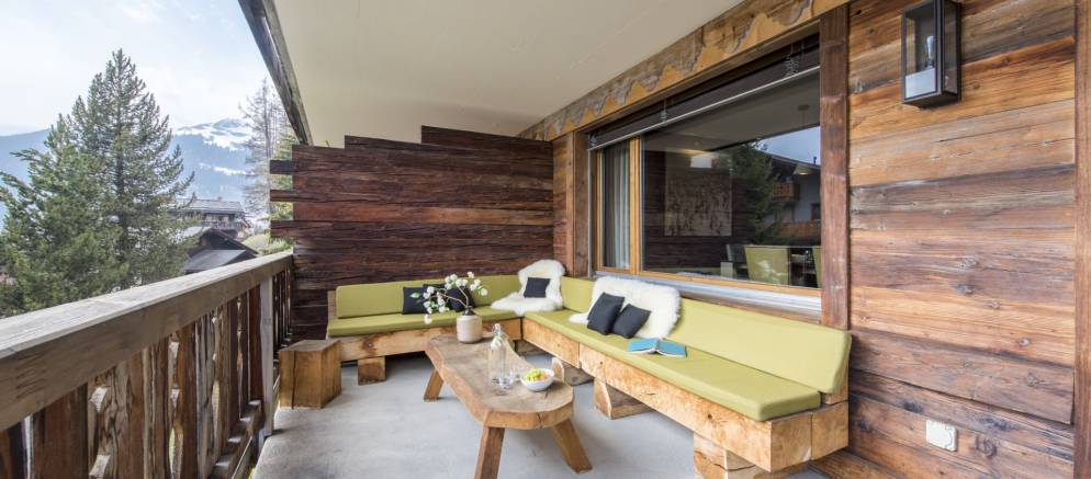 The living spaces are filled with natural light thanks to the large windows and sliding doors that open onto a covered balcony with stunning mountain views of the Petit Combin and Mont Rogneux.