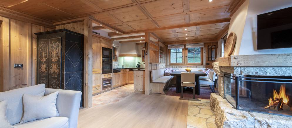 The hallway then opens into the open plan living spaces where the lounge area features a Bose speaker, wall-mounted flat screen with Apple TV and wood burning fireplace. The dining area comfortably seats six and the well-equipped semi-open kitchen has plenty of storage and a wine fridge. Large French doors open onto a private patio and flood this space with natural light and winter sunlight.