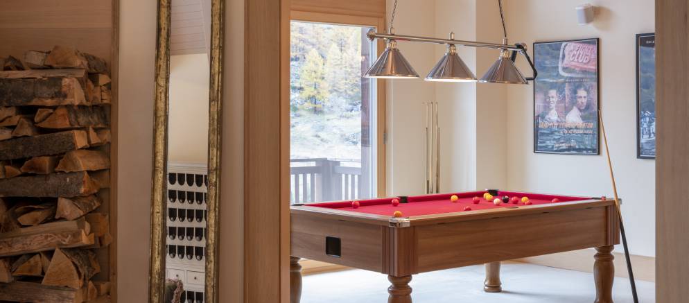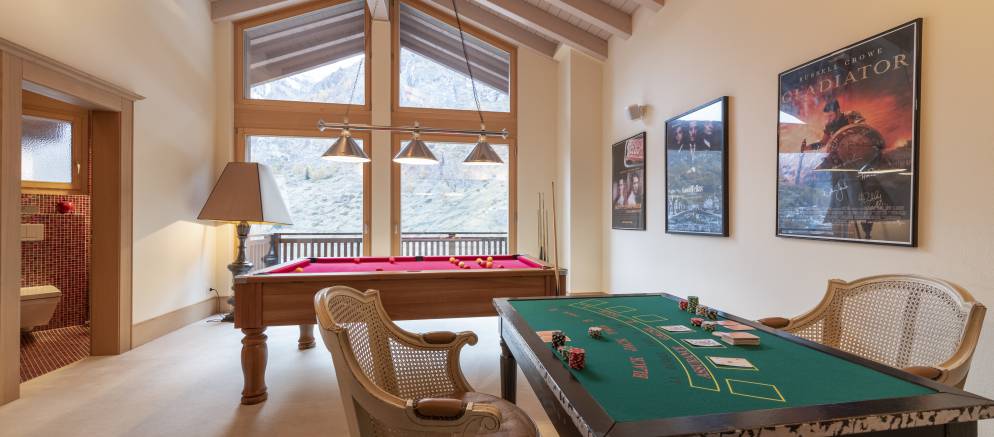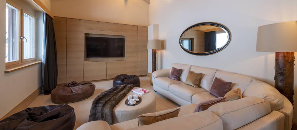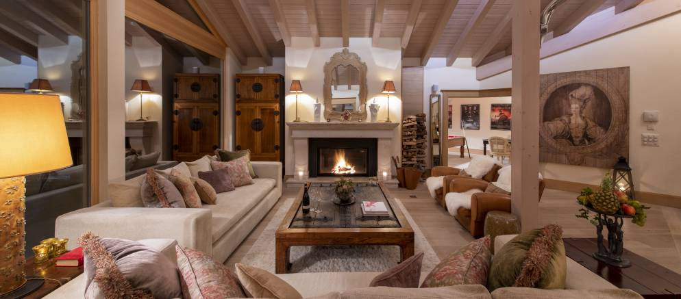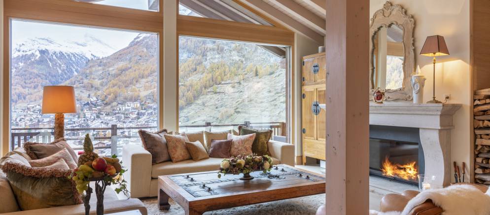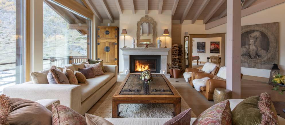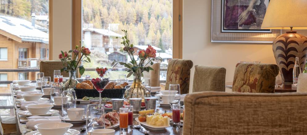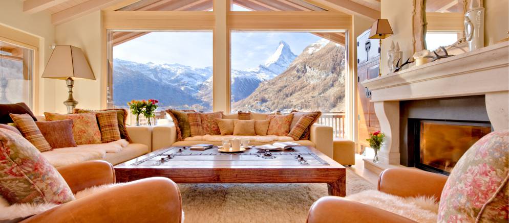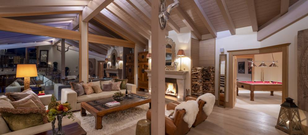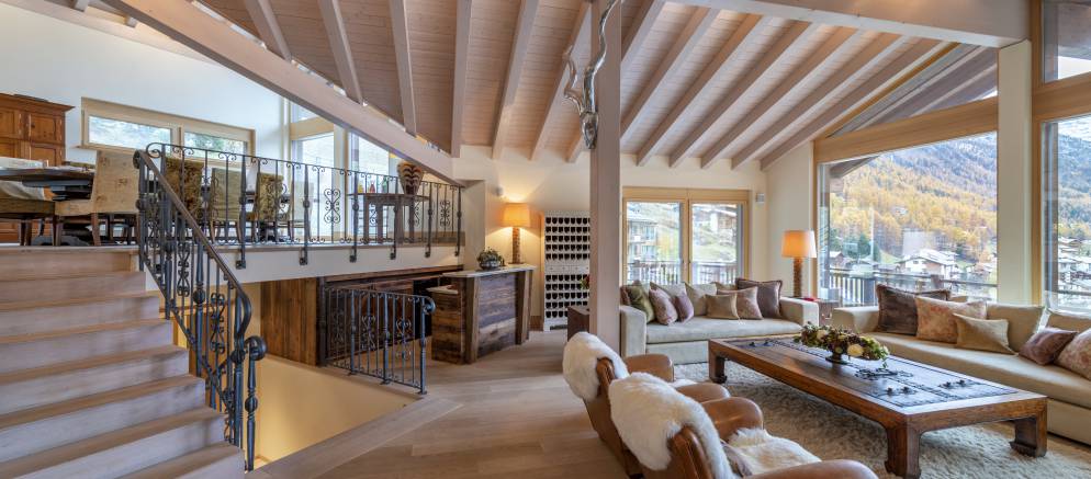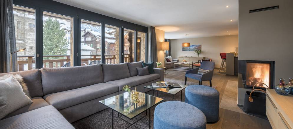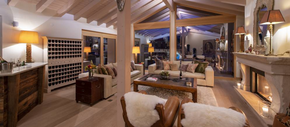 The stylish and comfortable open-plan lounge features a French stone fireplace and adjoining bar area, opening up to a large living area with loungers, tables and chairs. Here is the prefect place to enjoy a glass of champagne whilst soaking in the spectacular views of Zermatt below and the Matterhorn on the horizon from the large picture windows.