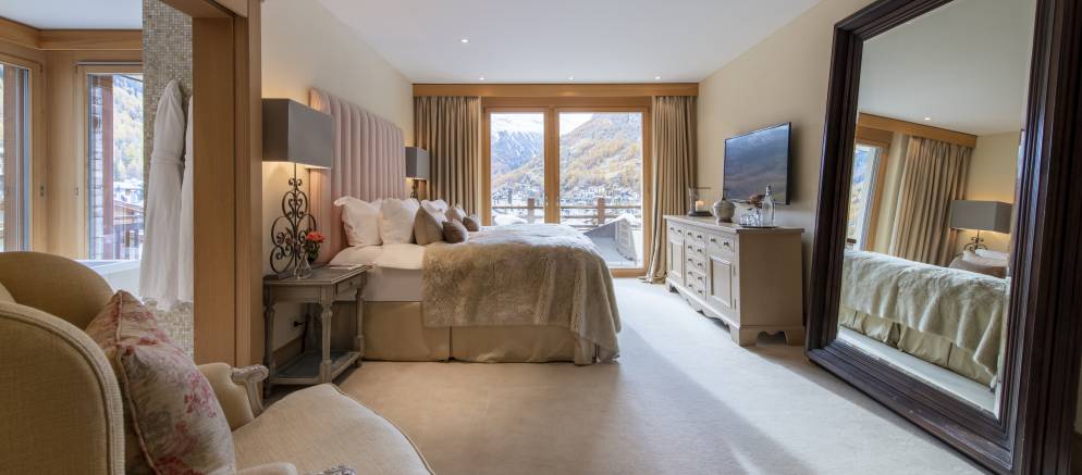 Twin or Superking double bed. En-suite bathroom with bath and separate shower. Opens to balcony with views across Zermatt to Matterhorn. Cable TV.