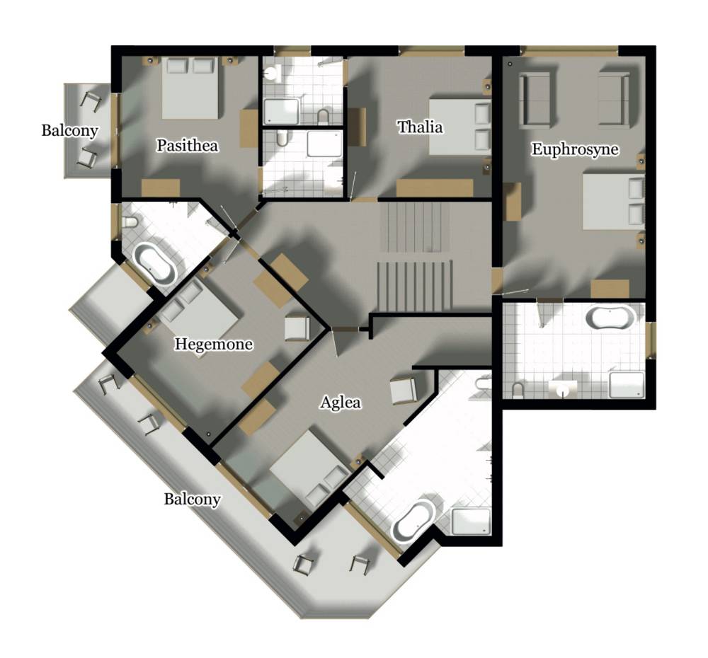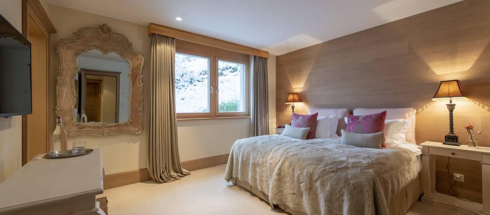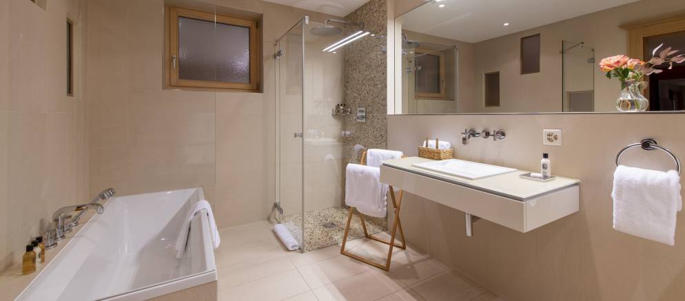 Twin or Superking double bed. En-suite bathroom with bath and separate shower. Opens to balcony with view across Zermatt to Matterhorn. Cable TV.