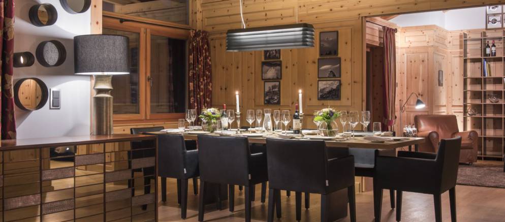 The spacious balconies afford breathtaking views of the Matterhorn providing the perfect backdrop for a pre-dinner drink or for soaking in the rays in the warmer spring months. After the sun sets, cosy up on the sumptuous sofas in front of the roaring fire. The main dining room can sit up to 20 people when taken as a whole chalet and the flexible living areas mean there is always somewhere to find peace and quiet.