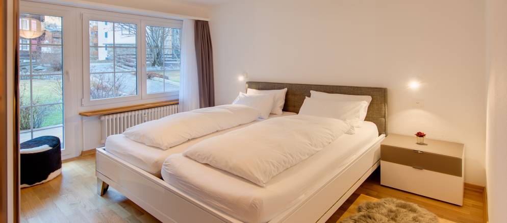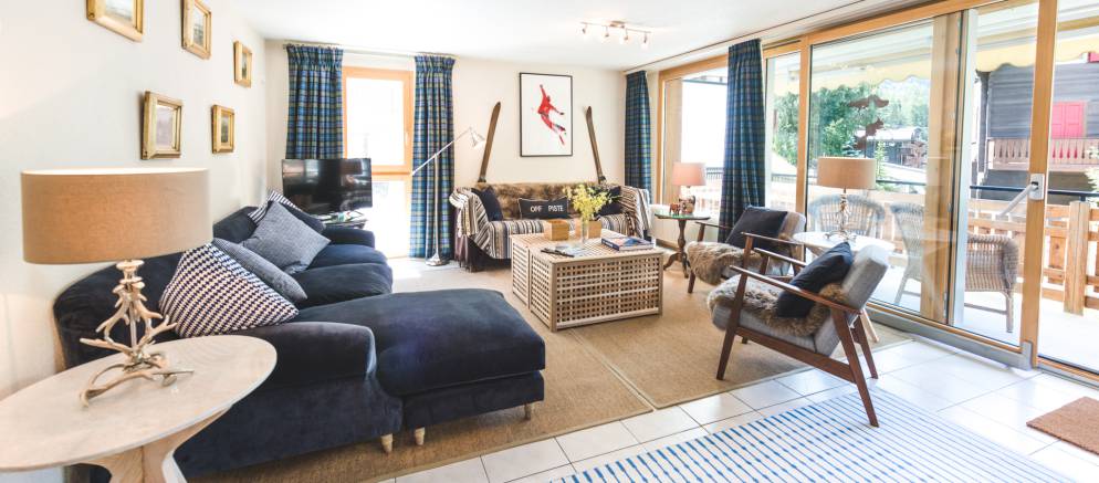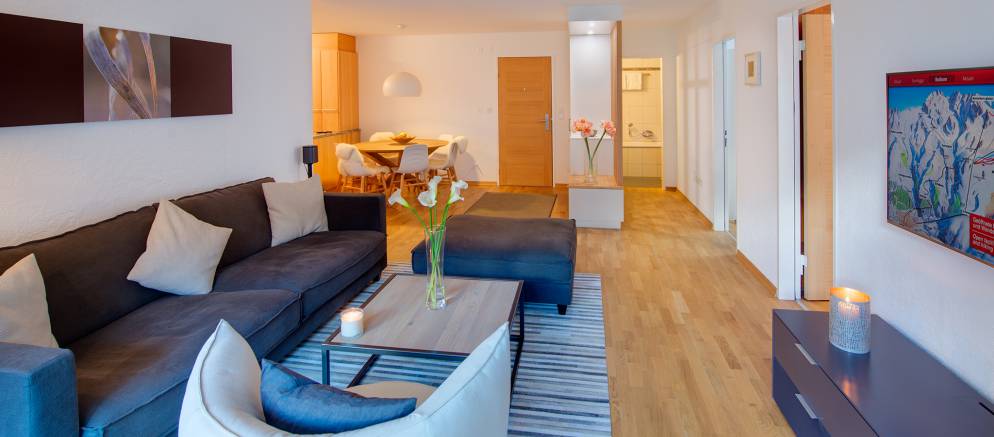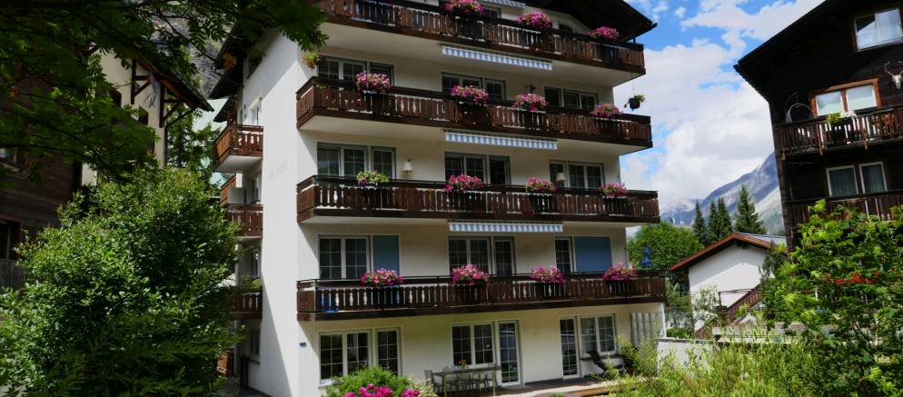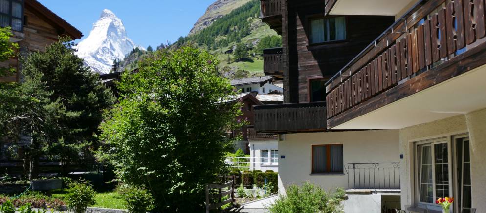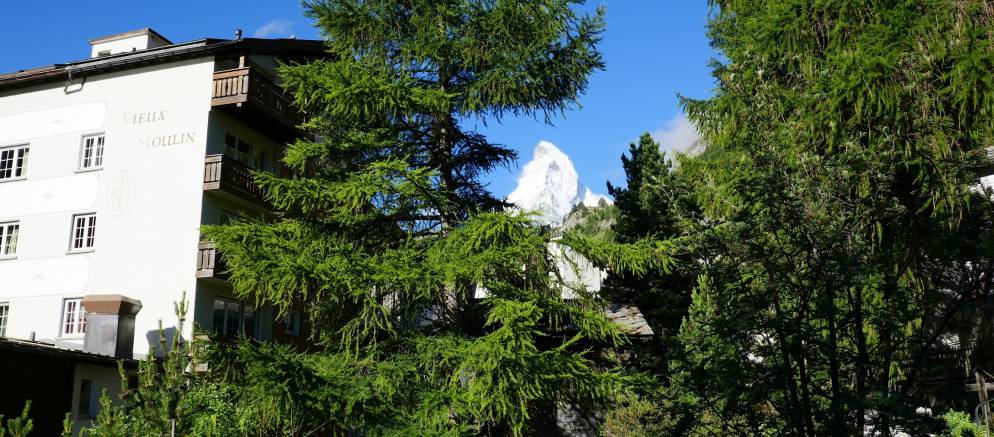 Chalet Vieux Moulin is a self-catered apartment in Zermatt. Sleeping six guests in three bedrooms and arranged over 95m2 of living space, this bright apartment has its own charming lawn and south facing deck with Matterhorn views. Located at the end of a quiet dead-end street and next to the church and a mountain river, you are in the heart of Zermatt.