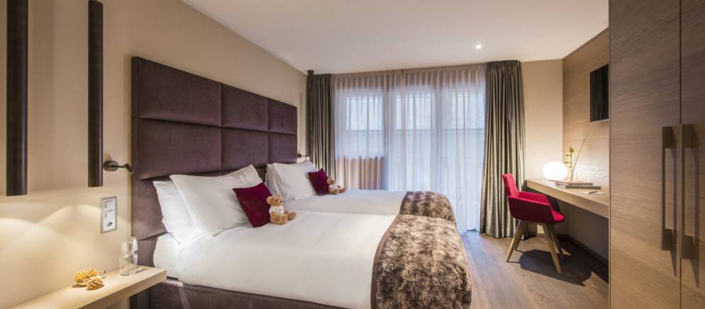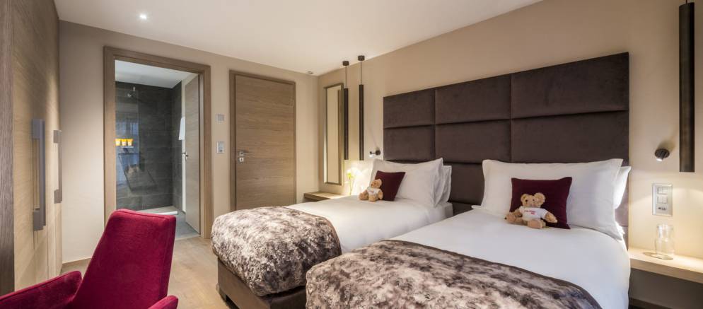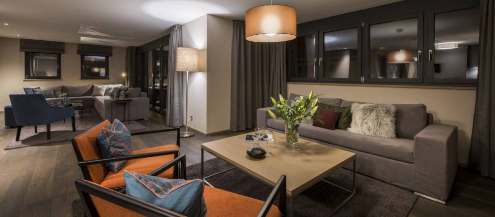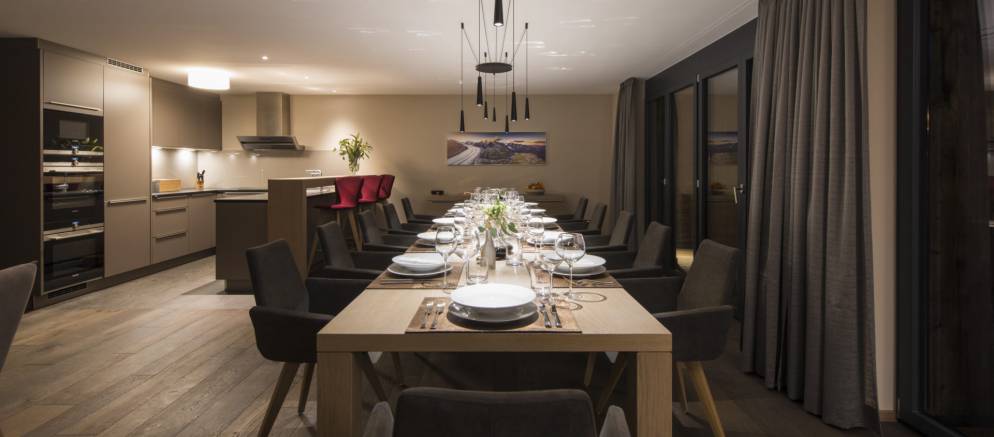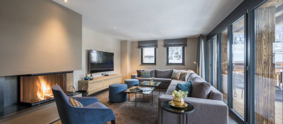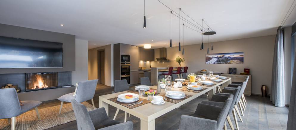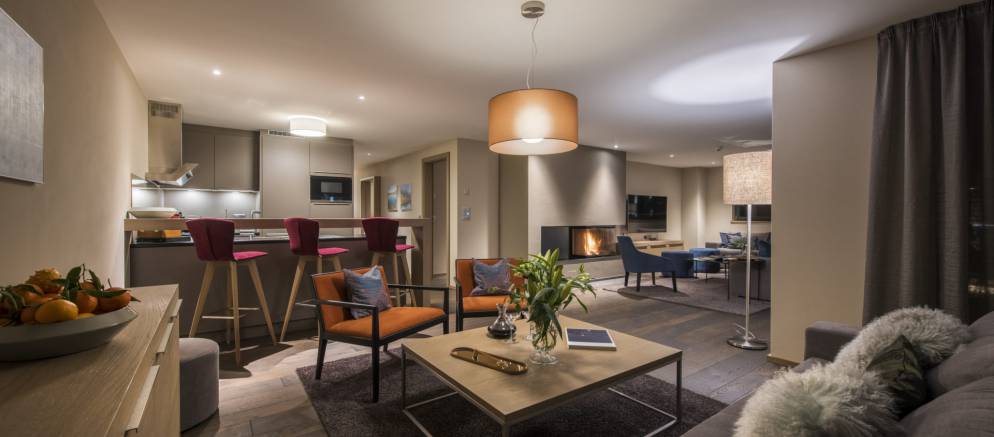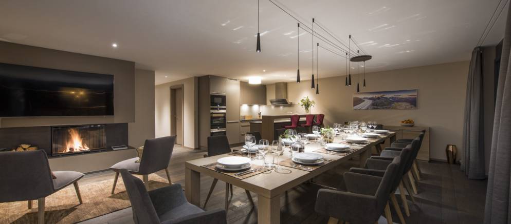 The flexibility of the property allows the whole group to relax together or should you wish to find a corner for some peace and quiet there is plenty of space. On each side, a wood burning fireplace sits in front of the comfy sofa and stylish seating areas, perfect for relaxing with a glass of champagne after a hard days skiing. This apartment features flat screen TVs and Wi-Fi access for your convenience and entertainment.