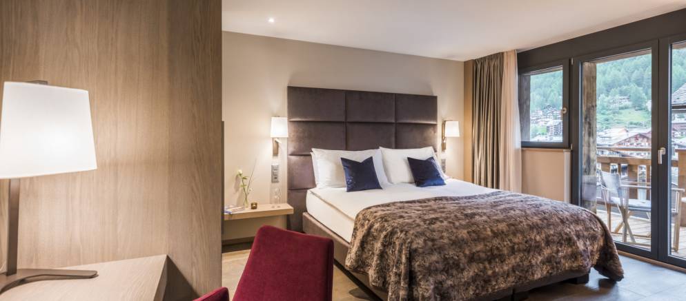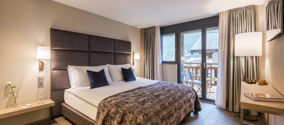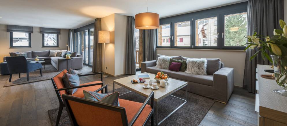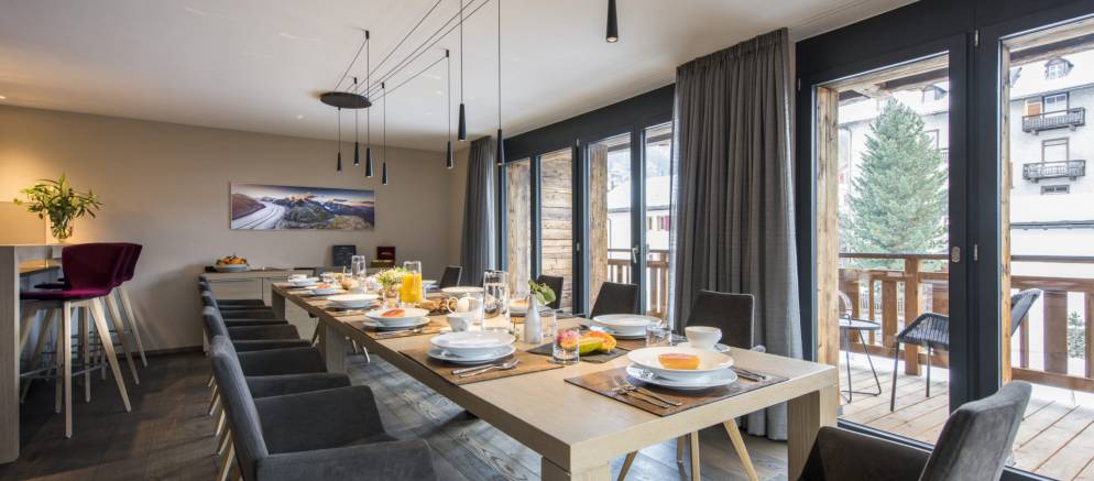 Christiania Apartment 7 is extremely spacious as it is two apartments seamlessly joined together. There are two open plan living and dining areas, both with floor to ceiling sliding doors which open out onto lovely balconies, with the main terrace looking towards the magnificent Matterhorn.
